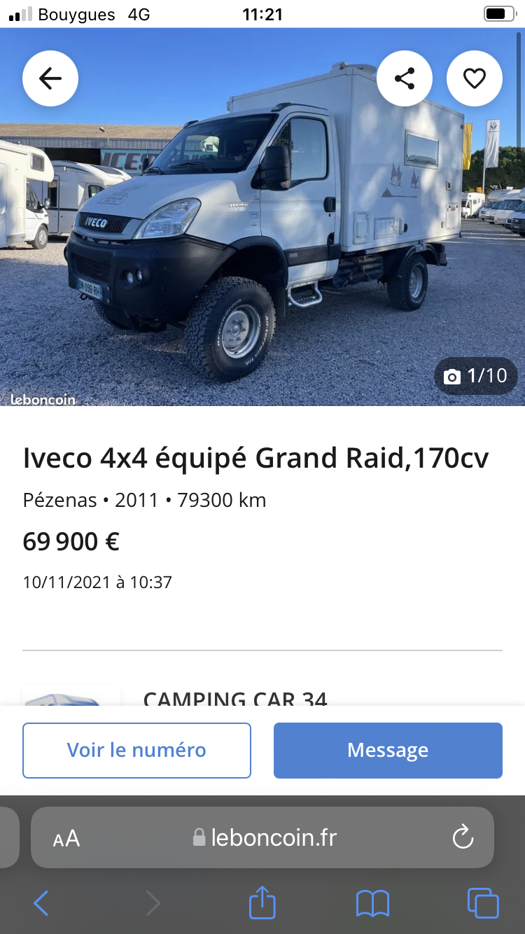 Iveco : -3T5, révisé, en parfait état , 3 places, équipé Grand Raid, Lames renforcées, Amortisseurs gonflables - gonflage indépendant par roue, Pneus BF 295 X 75-R16 en bon état (av = 95 %. AR = 75% avec roue de secours , Réservoir GO supplémentaire 100 L, remplissage séparé, avec commande dans l'habitacle, Barre anti-encastrement relevable, barre d'accessoires, Cellule sur mesure créée par O.C.C., spécialiste de l'aménagement de fourgon et cellule pour 4X4. Etat Neuf 2 panneaux solaire 100 w, batteries Lithium 2 X 60 ah neuves, panneau de contrôle intérieur , Tout l'éclairage LED, nombreux coffres de rangements intérieur & extérieur, Lit 140 X 195, + lit enfant, table amovible 4 personnes 2X 80 L d'eau propre avec remplissage séparé + 40 L d'eau usée, chauffage avec kit altitude & eau chaude, TRUMA Combi 6 G.O. avec Bowler 10 L, répartition du chauffage dans l'habitacle et les coffres de rangement. WC à cassette (15 L) avec SOG, douche intérieur & 2 douchettes extérieurs, Cuisine 2 feux gaz + évier, frigo Engel 40 L, grandes bajes vitrées avec store occultant et moustiquaire, 2 lanterneaux avec moustiquaire et store occultant, store extérieur 3m50 avec éclairage LED (bande de 3m50), Plaques désensablage, échelle d'accession au toit, gonfleur, convertisseur 12v / 220v avec prises intérieur, prises 220v réseau intérieur & extérieur (2), prises 12v, extincteur, Divers pièces de rechanges. Caméra de recul, trou d'homme.