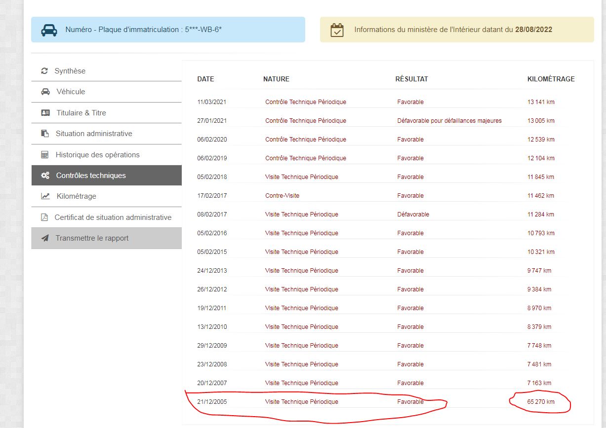 Sur Histovec, il y a un truc bizarre c'est le kilométrage au premier contrôle technique en 2005, au bout de 8 ans déjà.