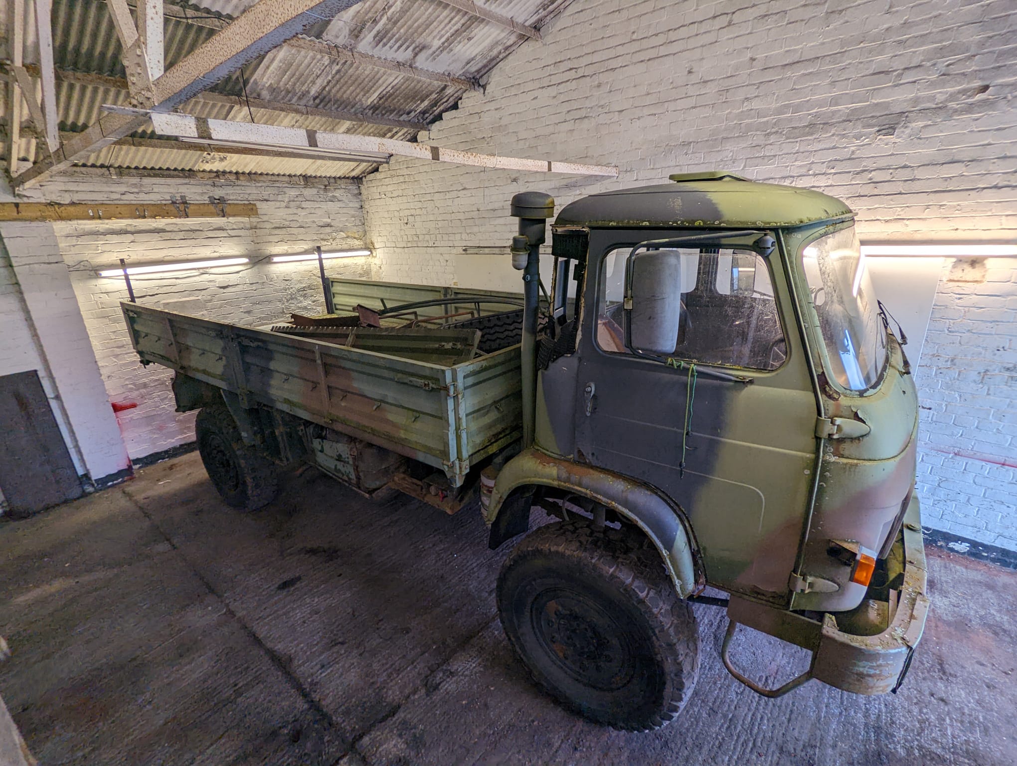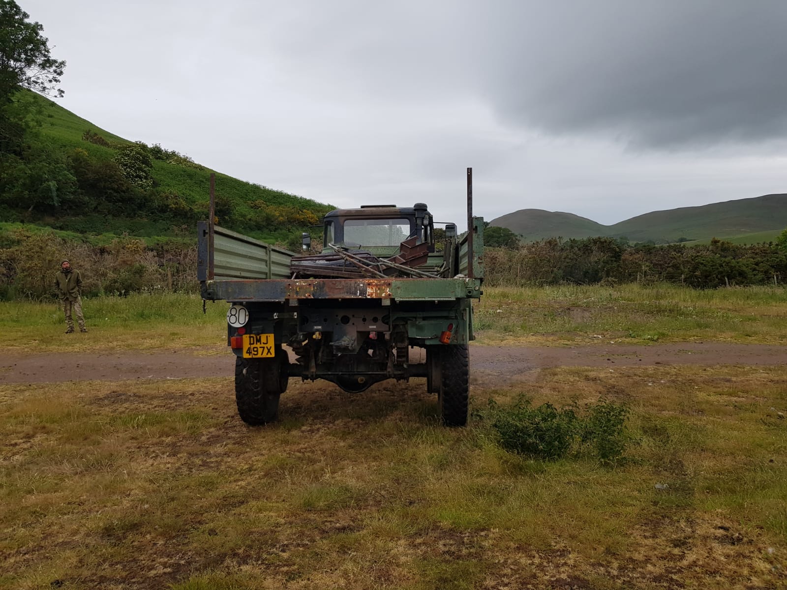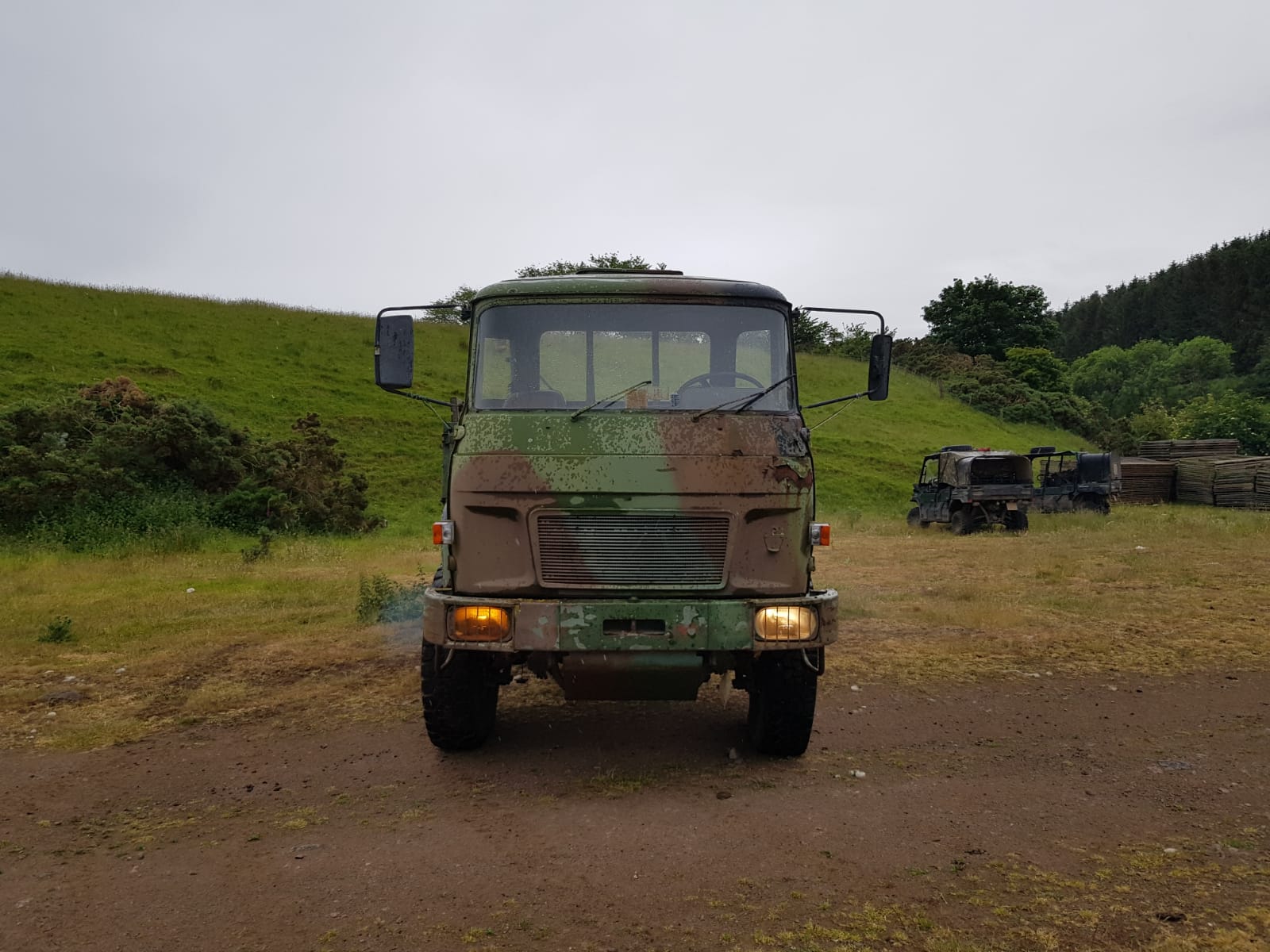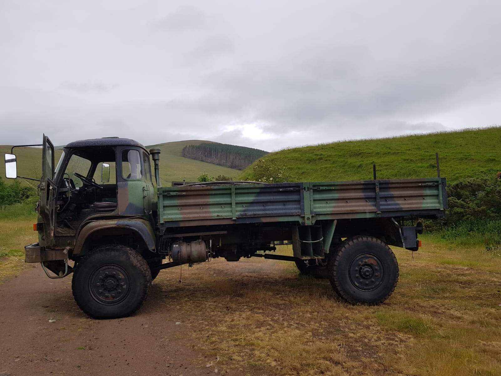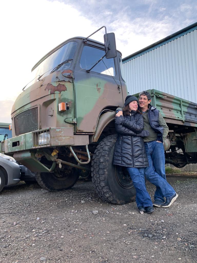 We are Dani and Justin and we have just bought our TRM 4000. We think it was registered in 1982 and came to England in 1990 it has been working on a shooting estate. It drives with a lot of white smoke, leaks air from the tanks and there's not much floor in the cabin