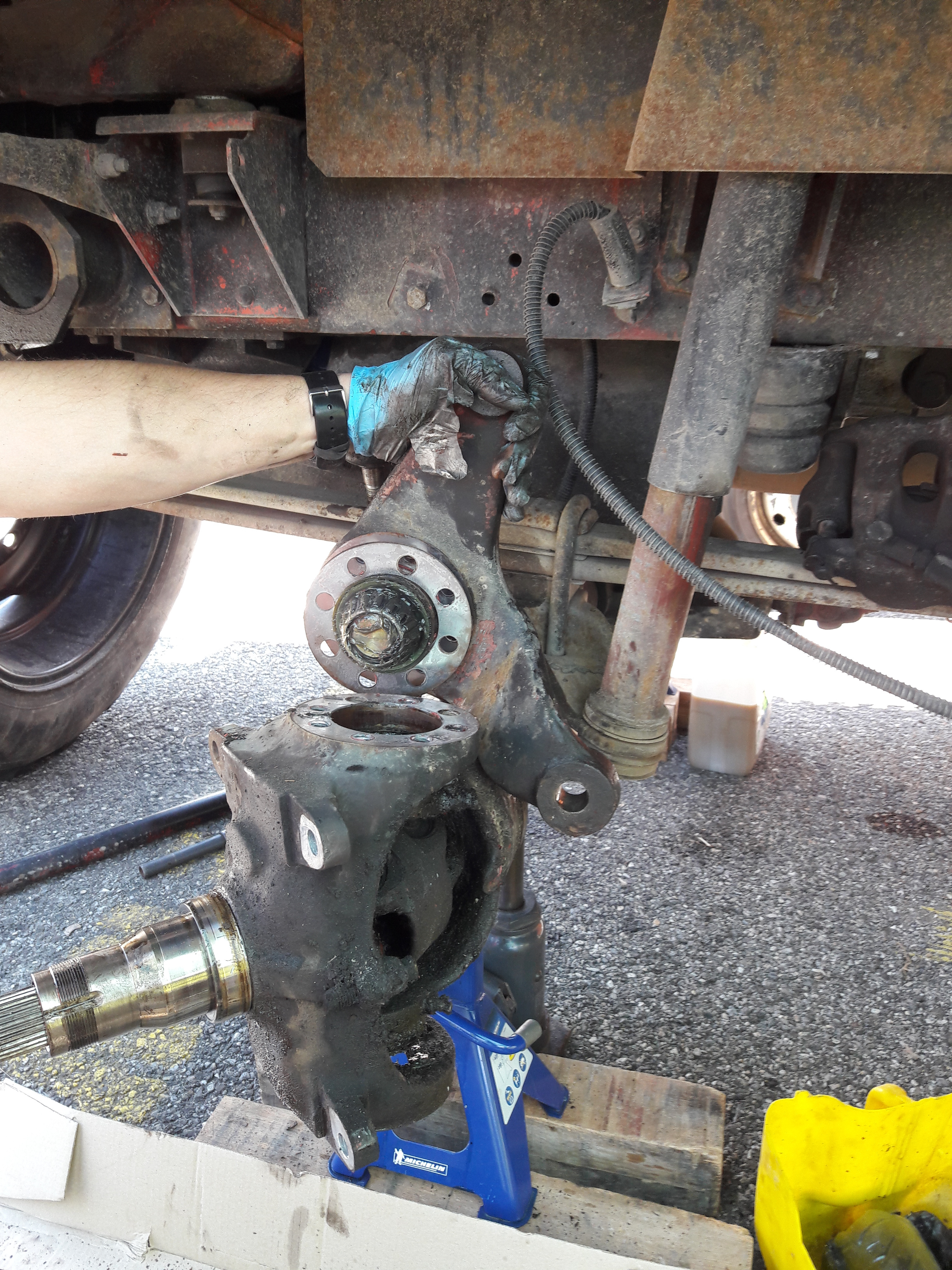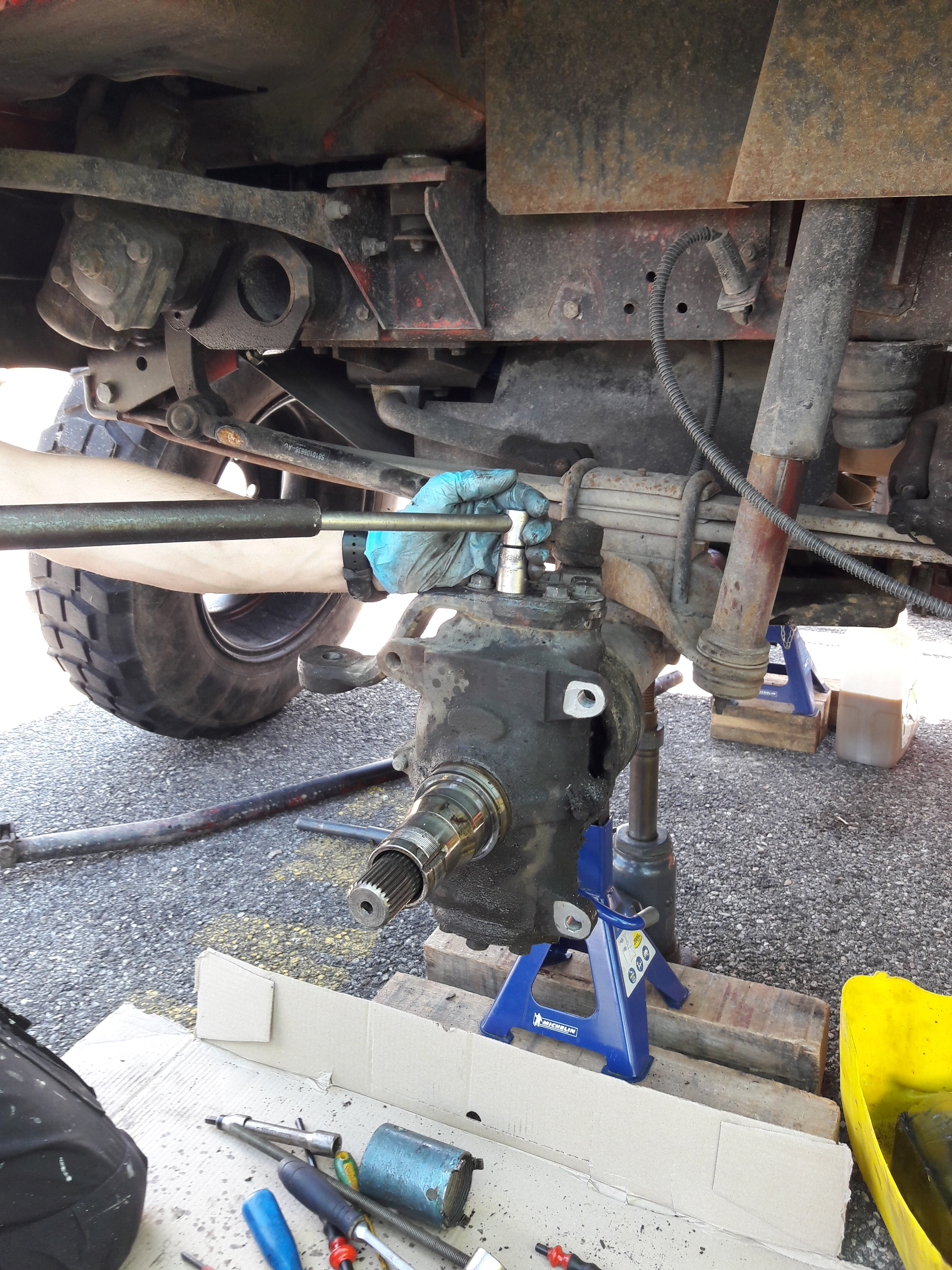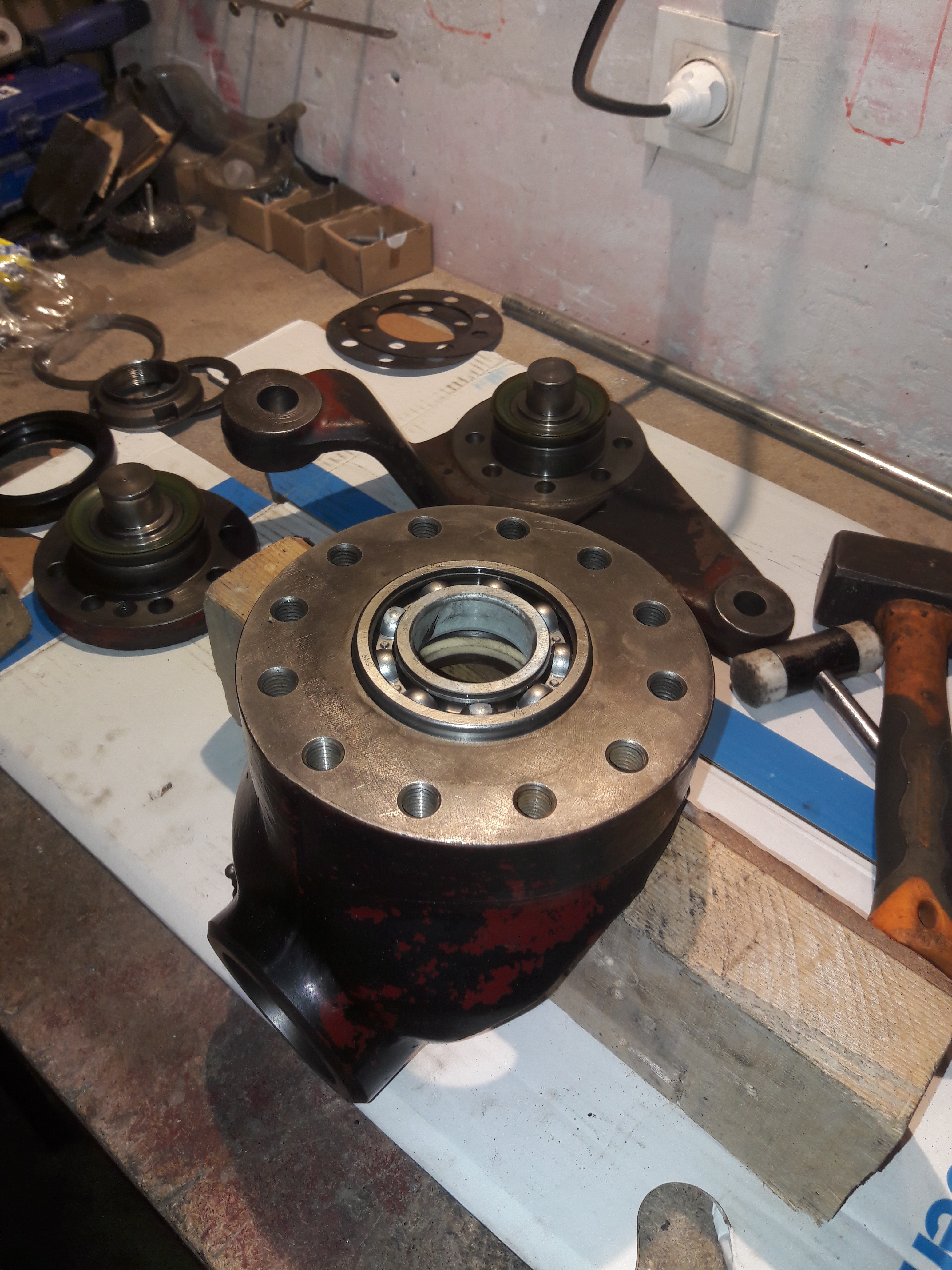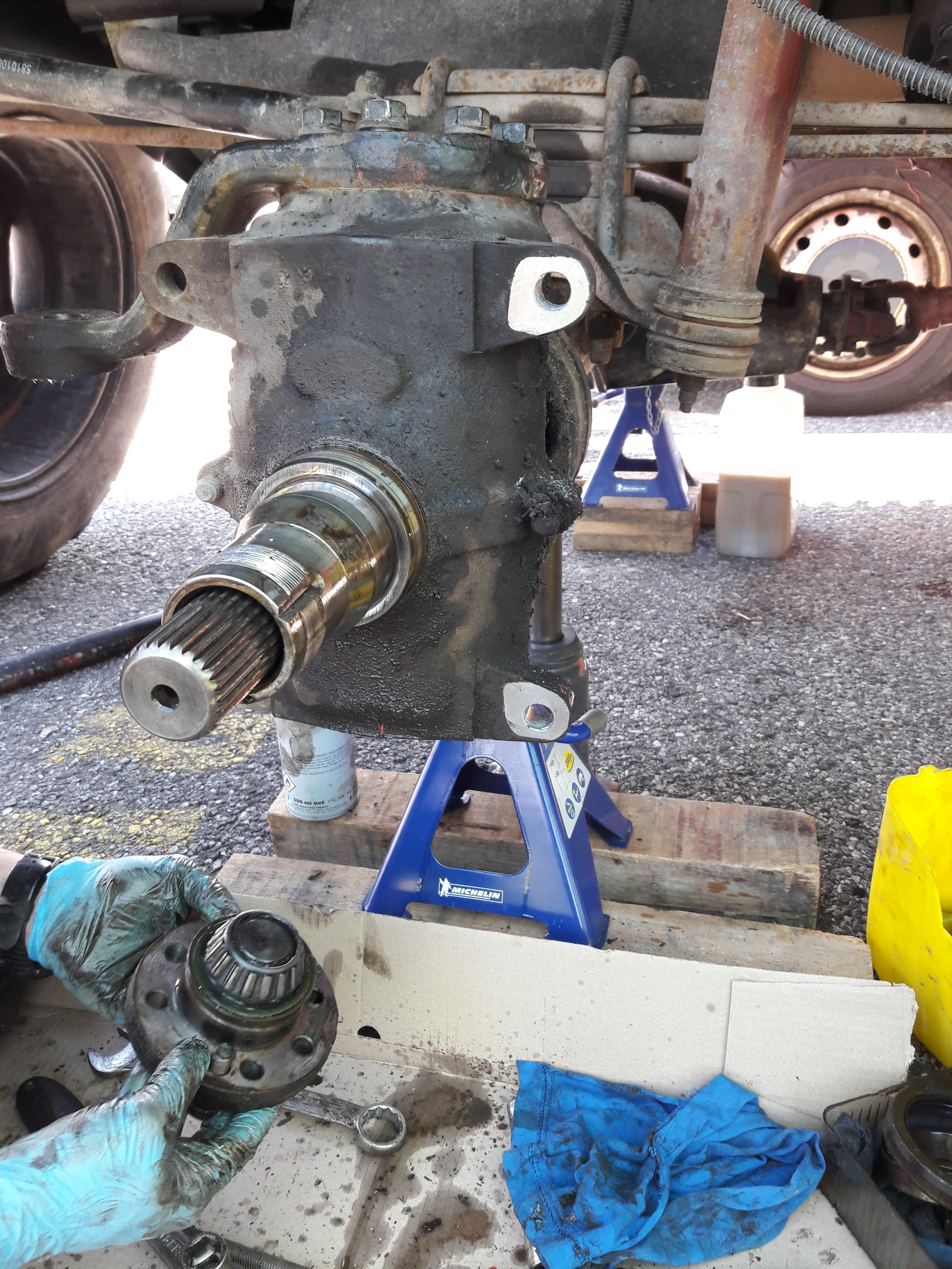On remonte dans l'ordre : carter de pont et son demi arbre, pivot, levier de pivot (ne pas oublier les cales),moyeu, roulement, rondelle, écrou, penser à mater l’écrou, main meneuse, peinture.