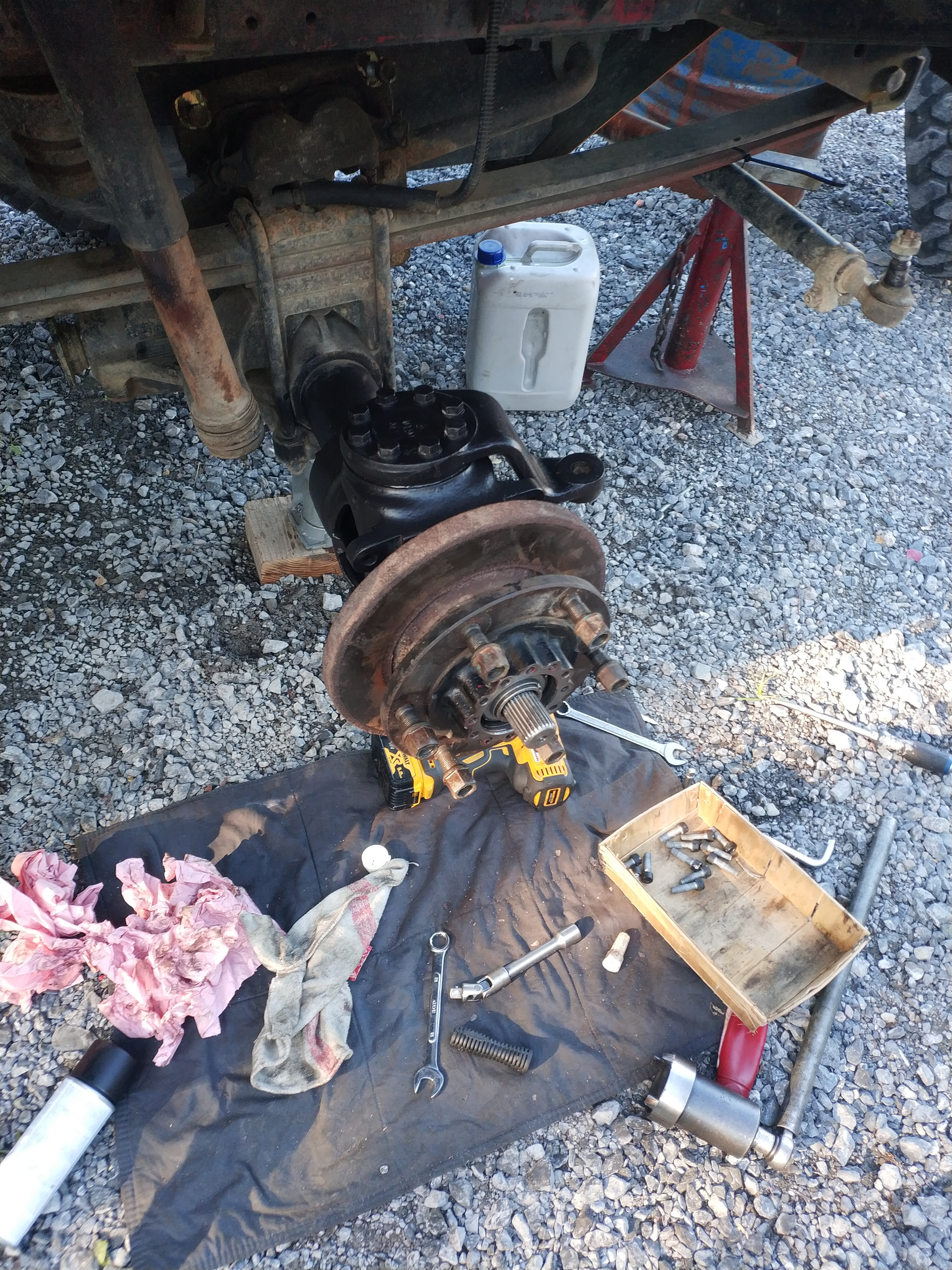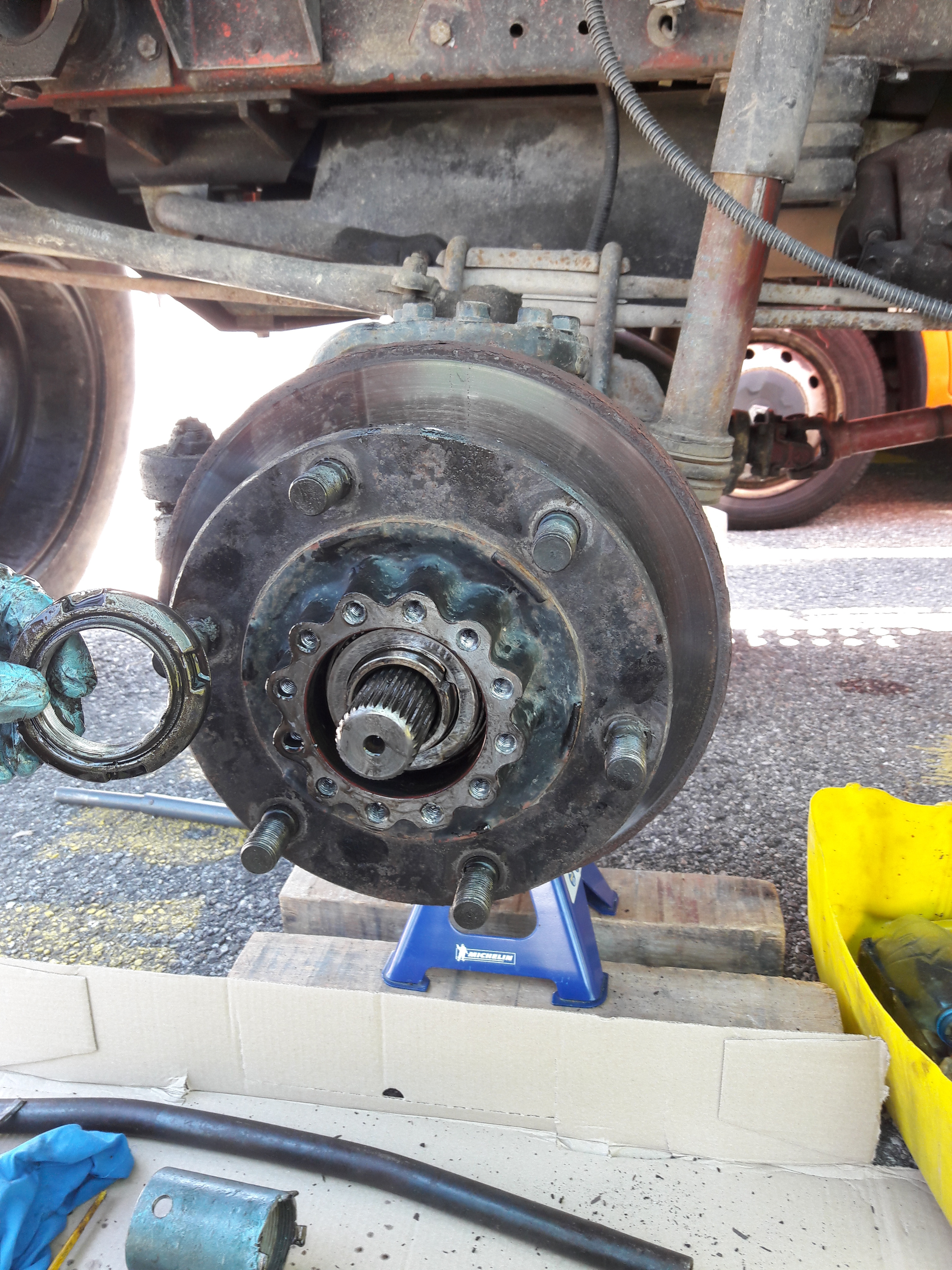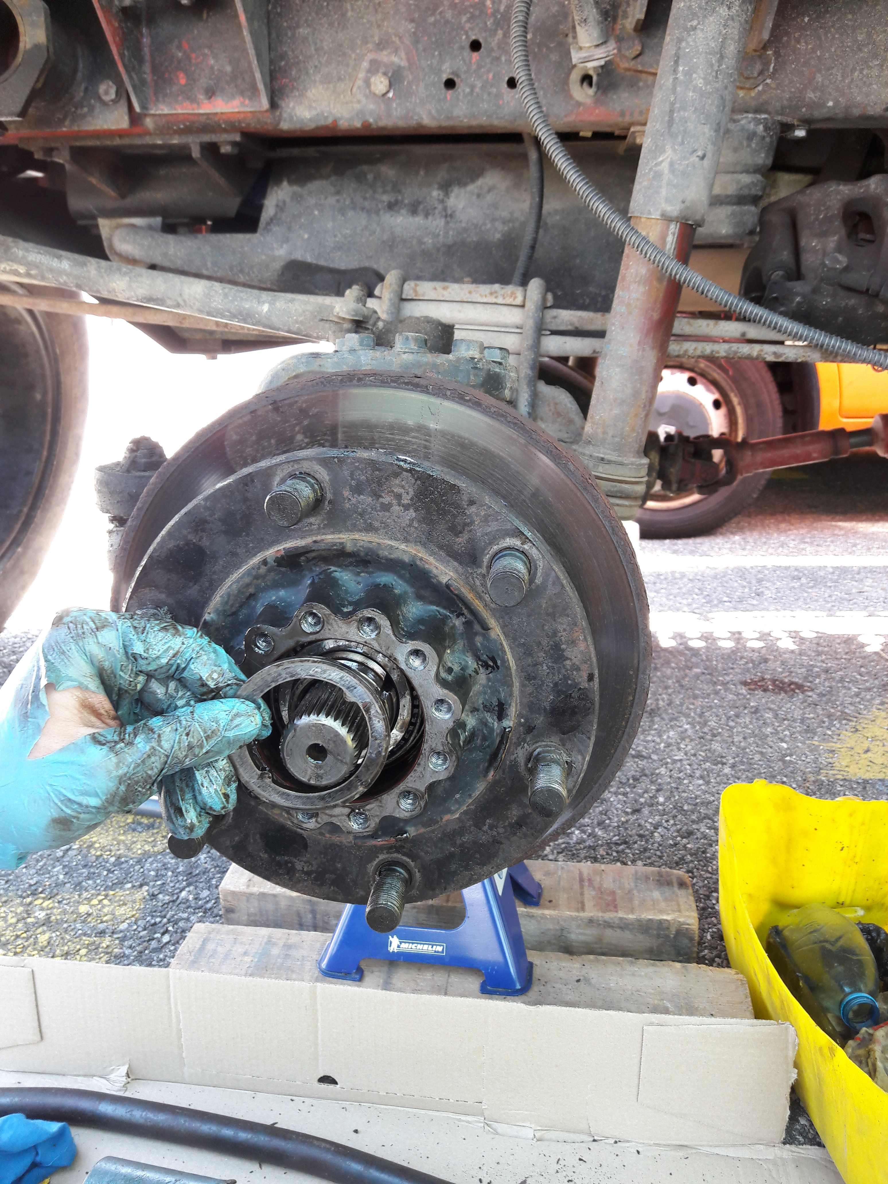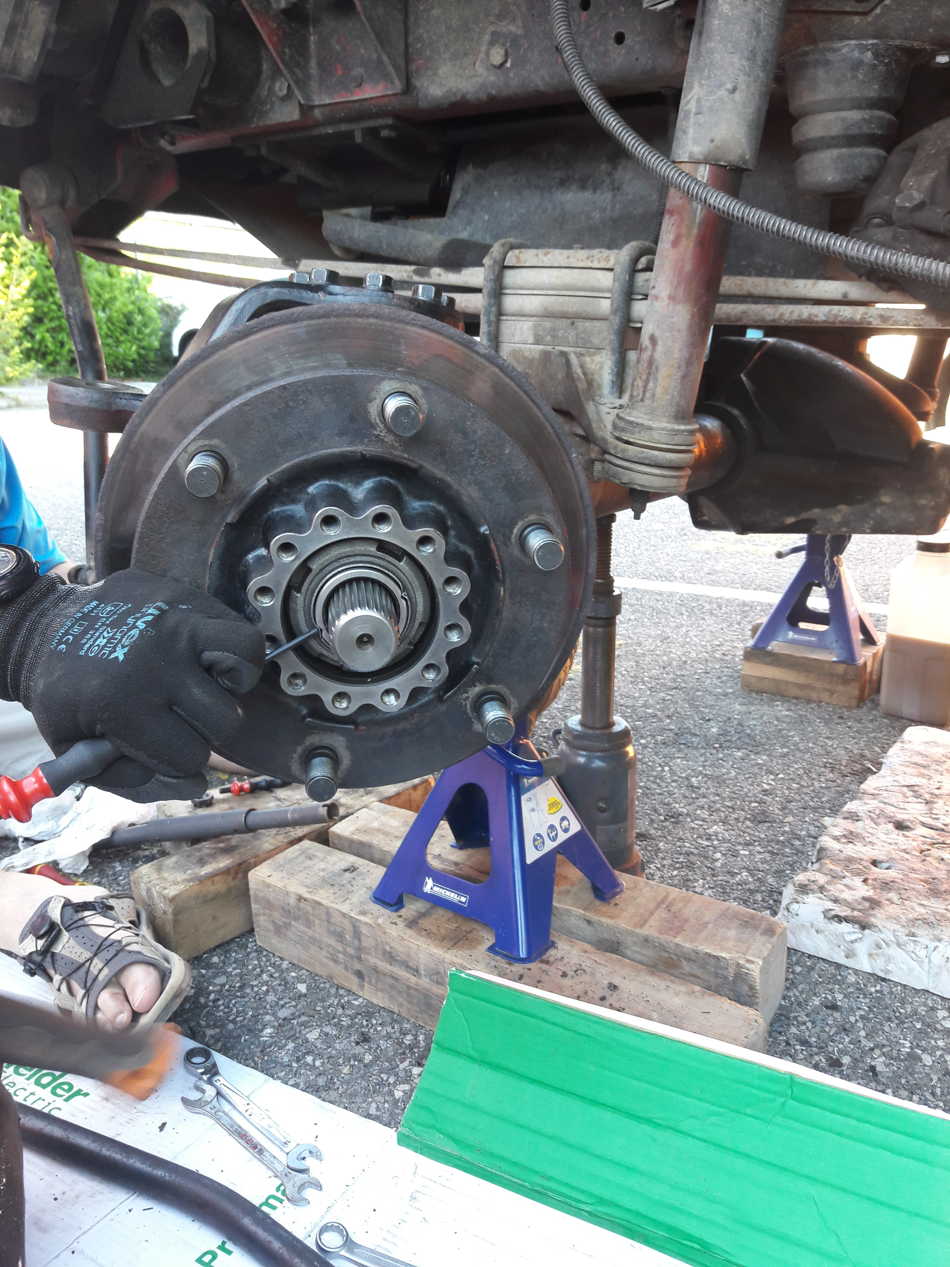 On remonte dans l'ordre : carter de pont et son demi arbre, pivot, levier de pivot (ne pas oublier les cales),moyeu, roulement, rondelle, écrou, penser à mater l’écrou, main meneuse, peinture.