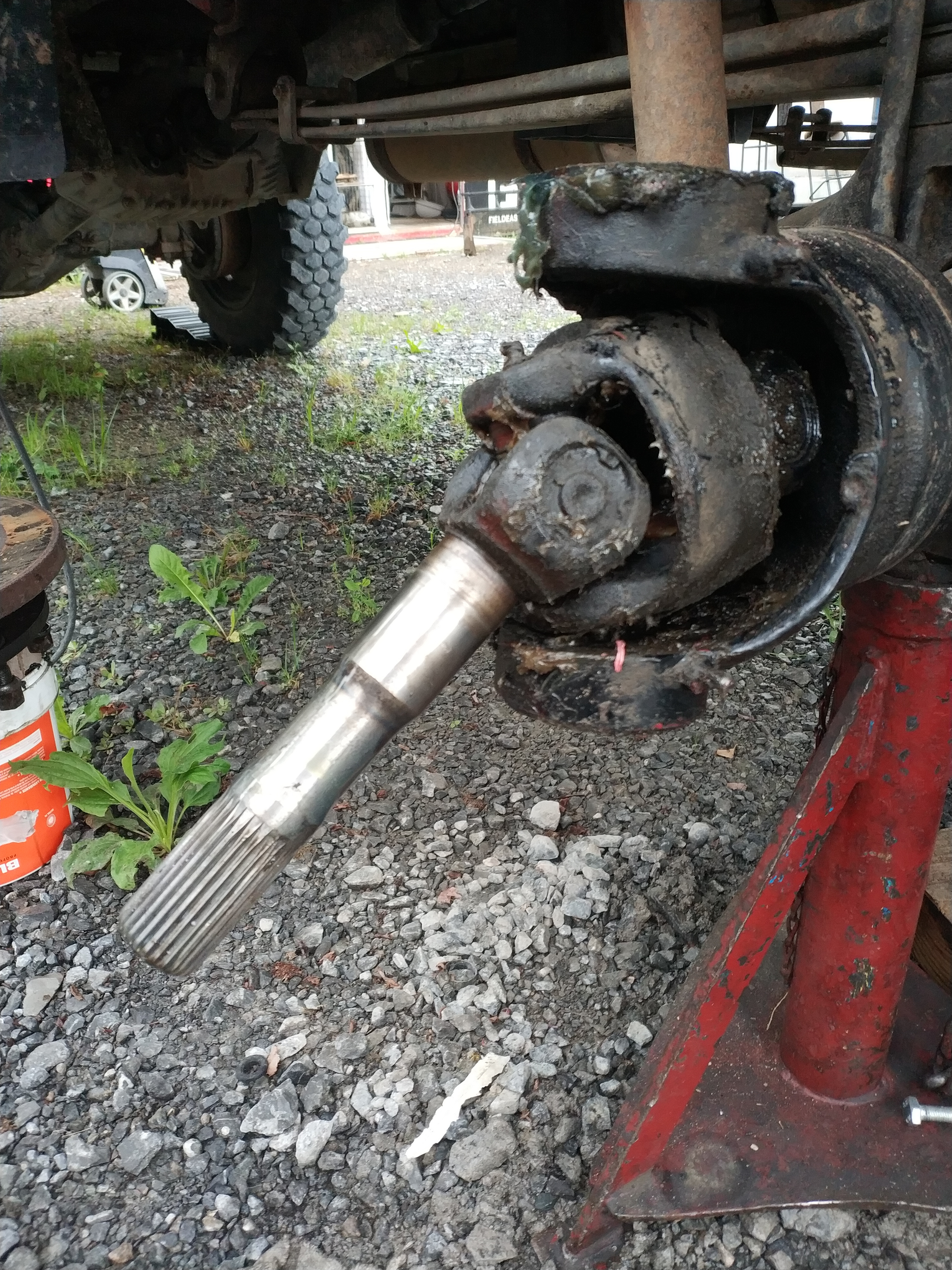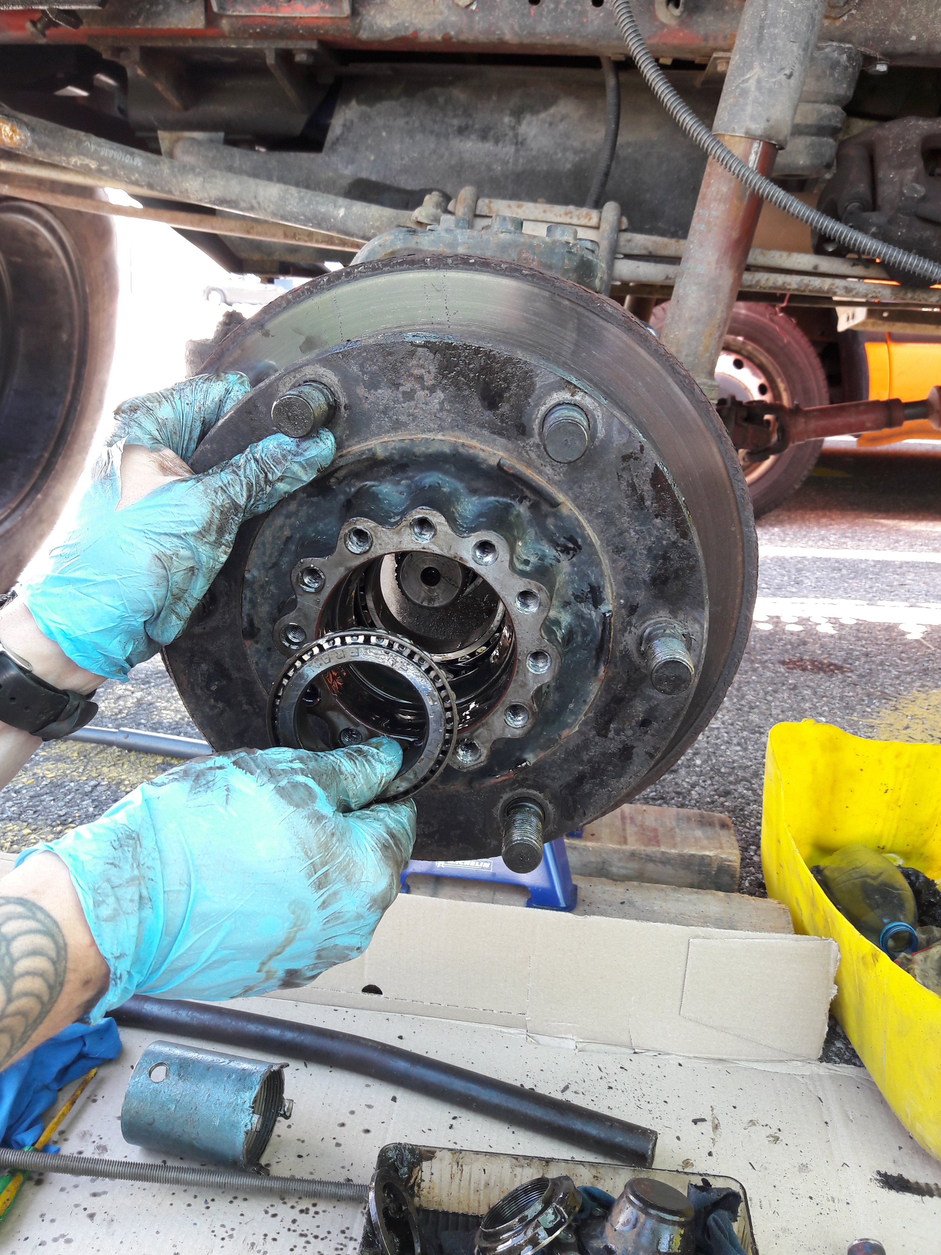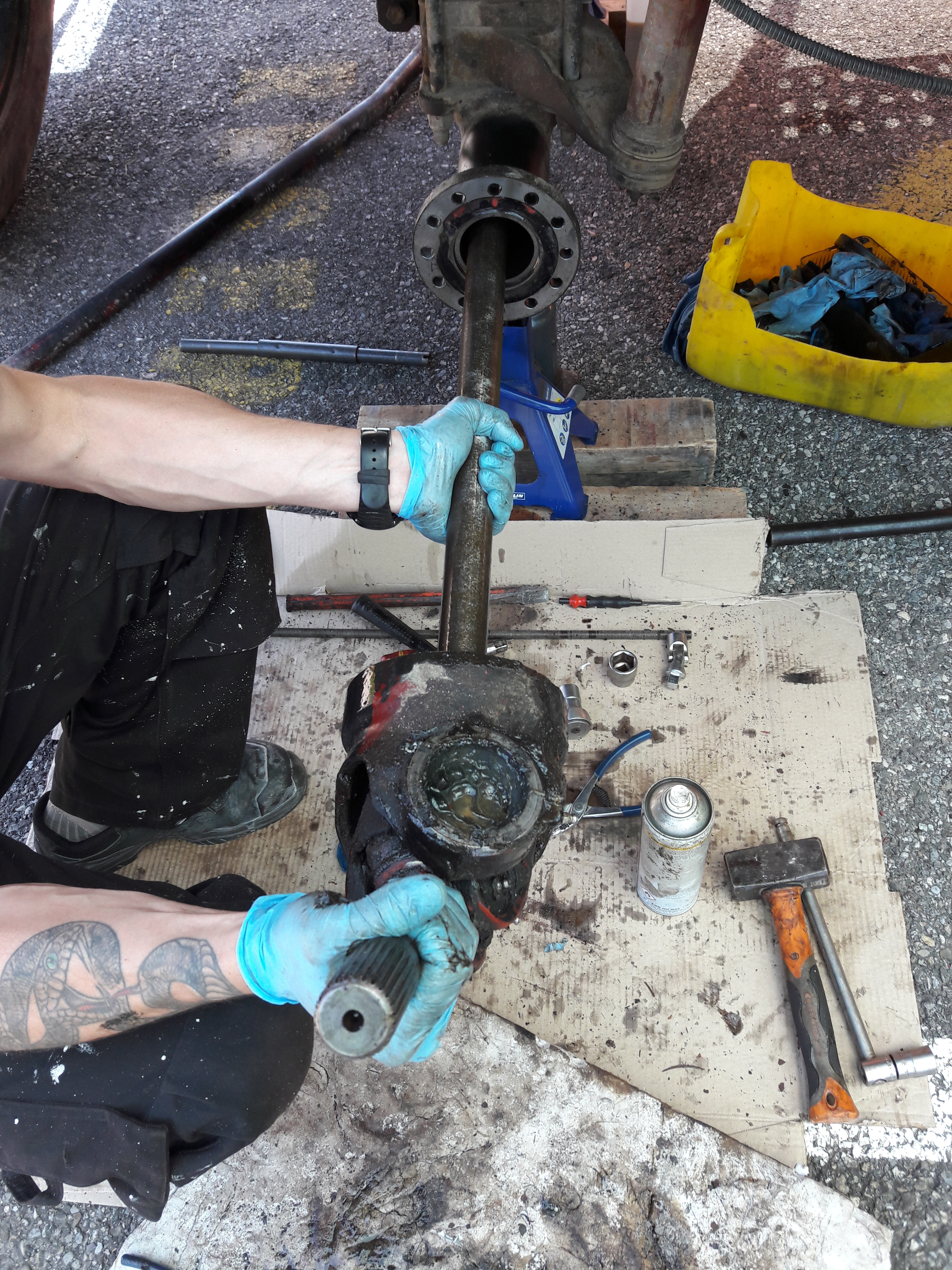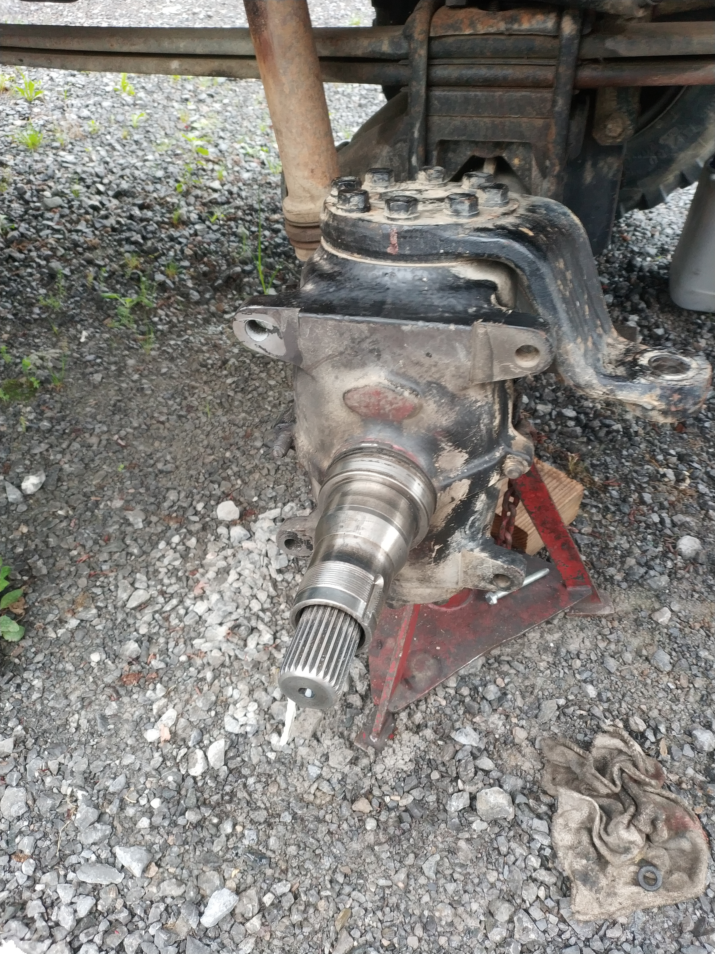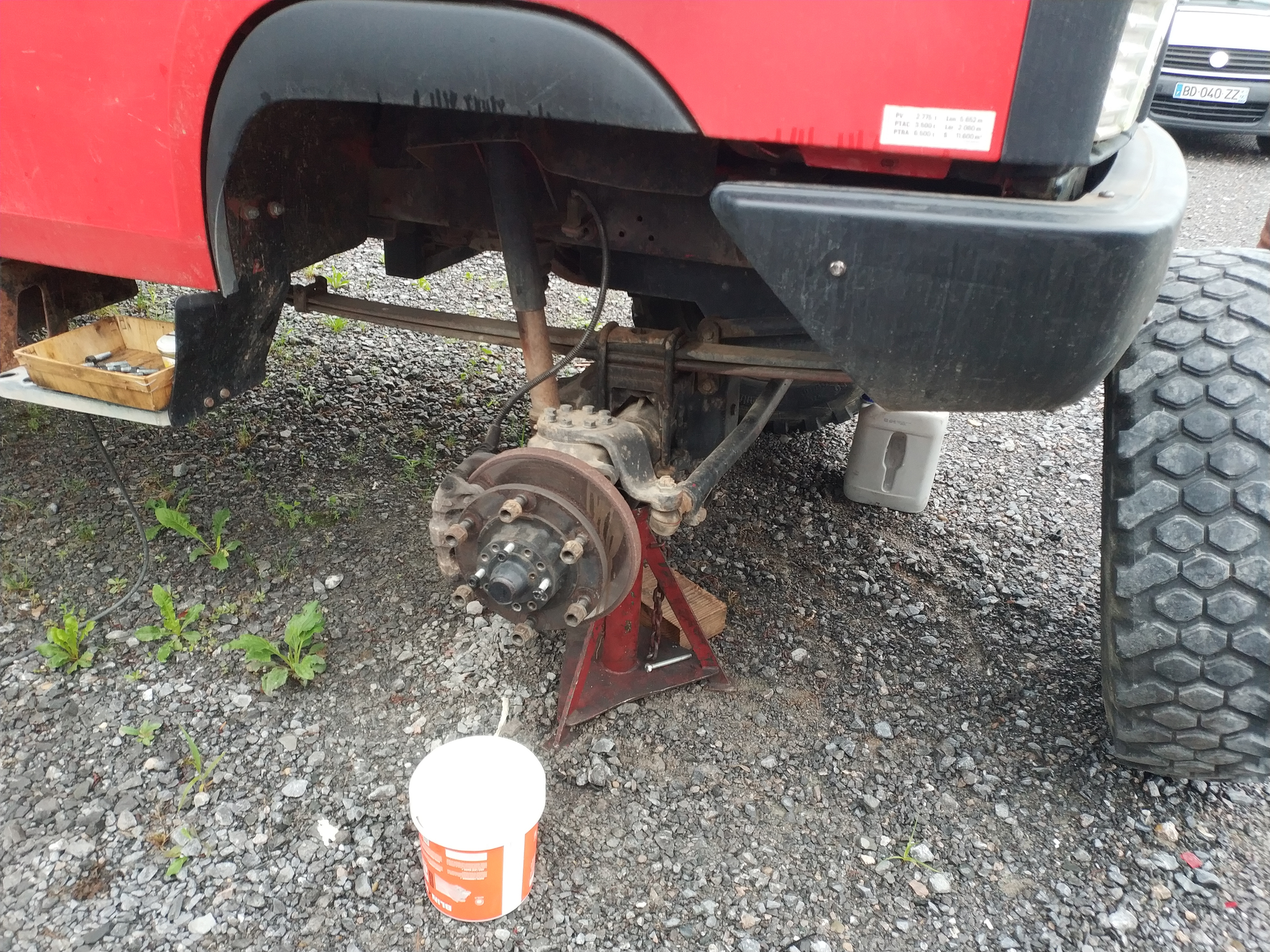 On remonte dans l'ordre : carter de pont et son demi arbre, pivot, levier de pivot (ne pas oublier les cales),moyeu, roulement, rondelle, écrou, penser à mater l’écrou, main meneuse, peinture.