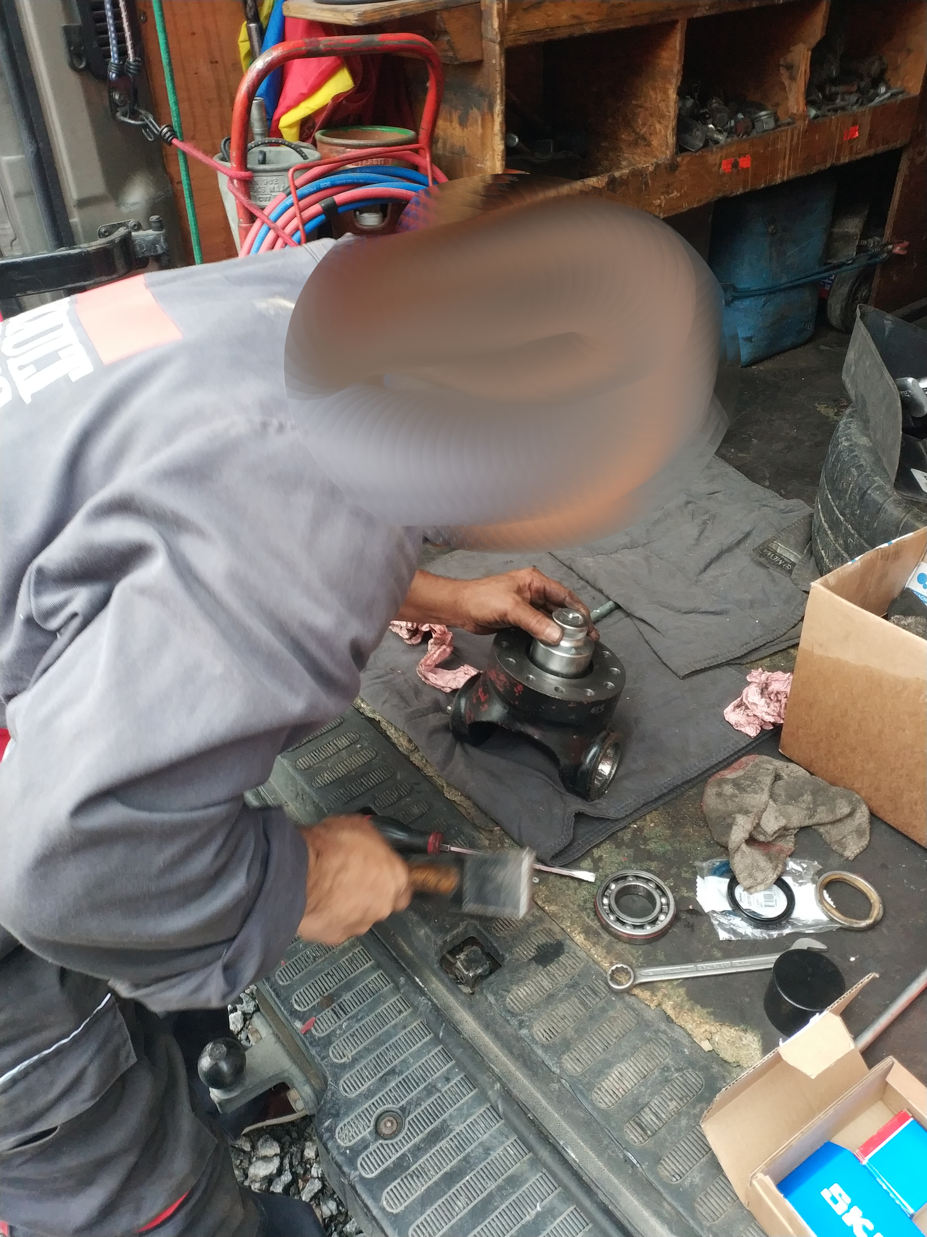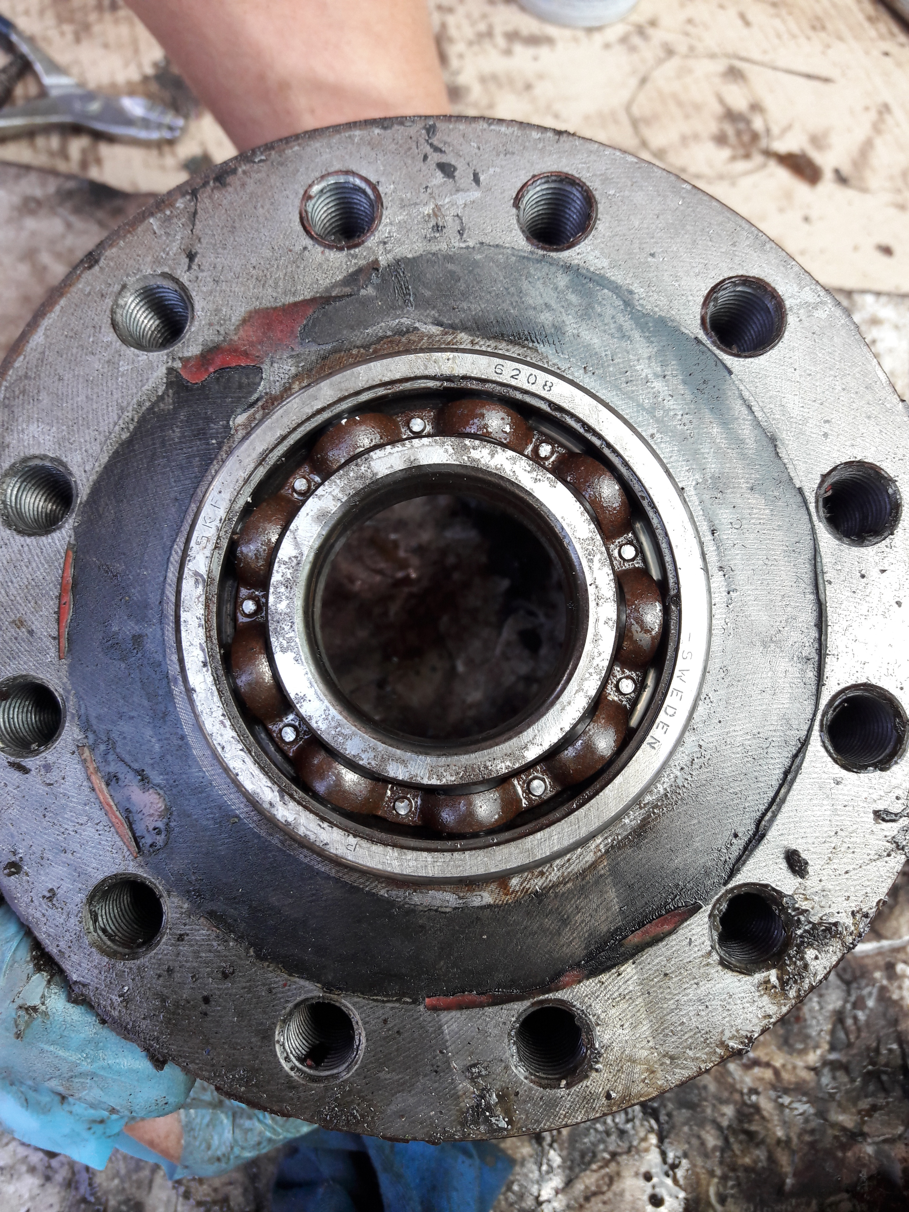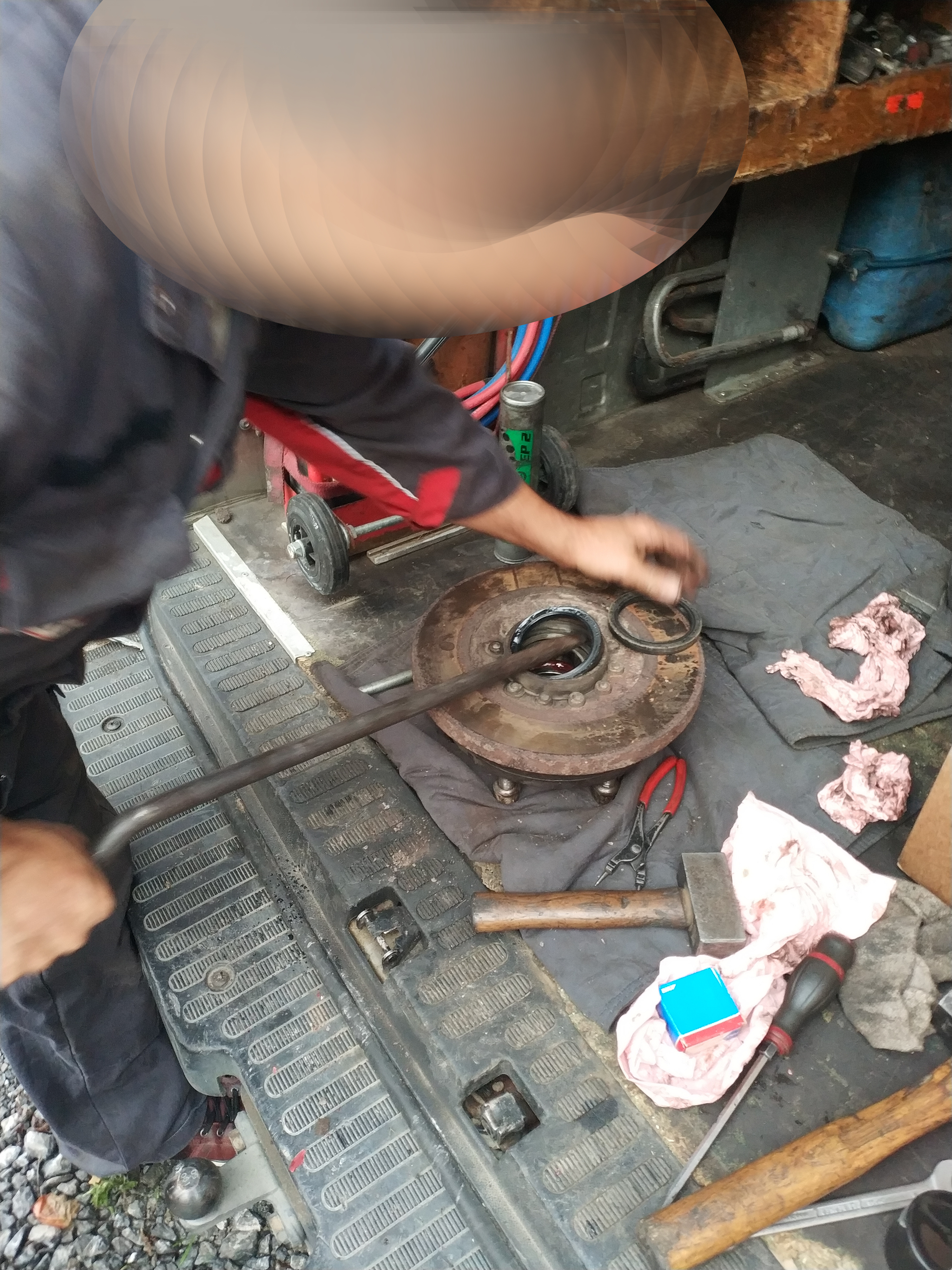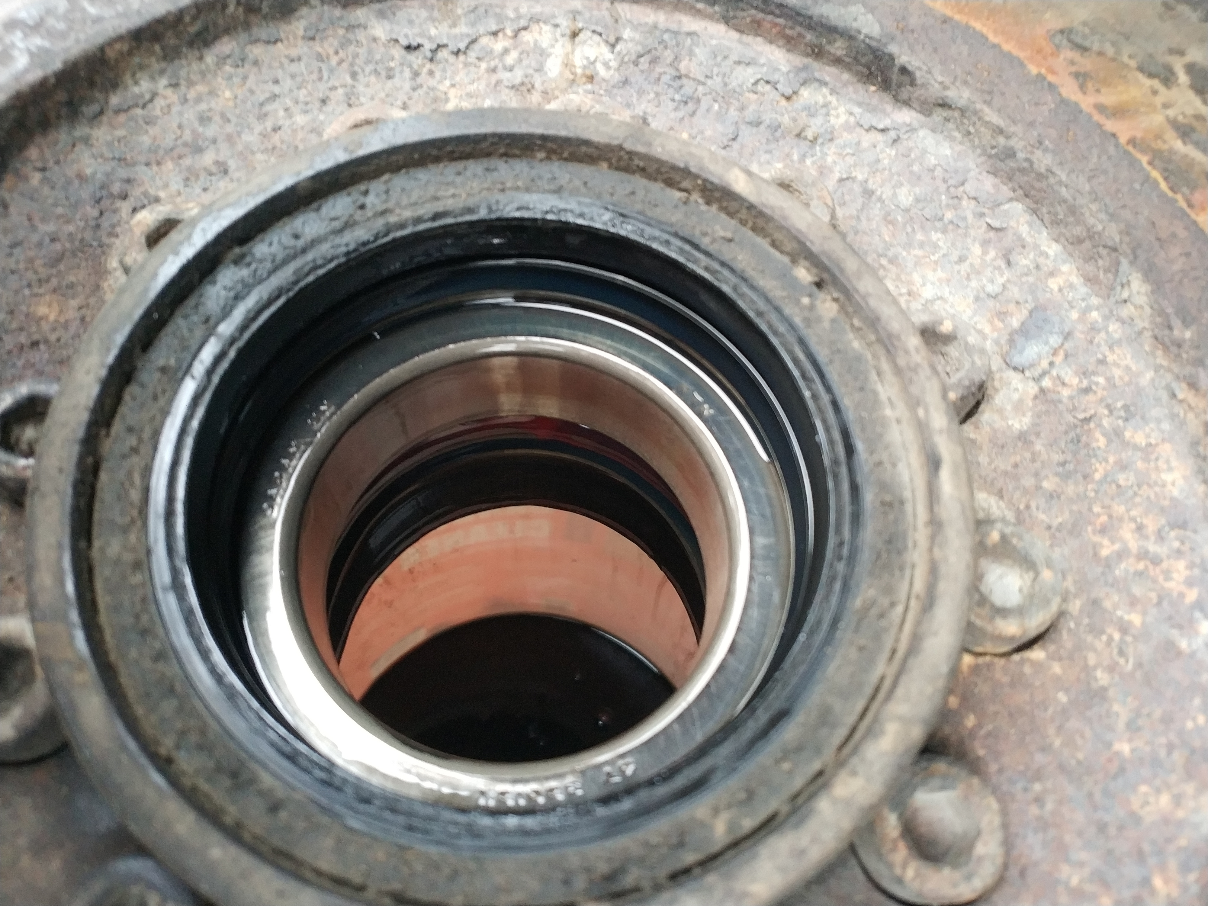 8) On s'attaque au moyeu, sortir dans l'ordre : le double (ou les deux joint spi 75x95x10), le roulement. Ici uniquement les joints spi on été remplacés. On remonte dans l'ordre : roulement, joints spi 75x95x10, joints spi 75x95x10 (oui on en met 2)
