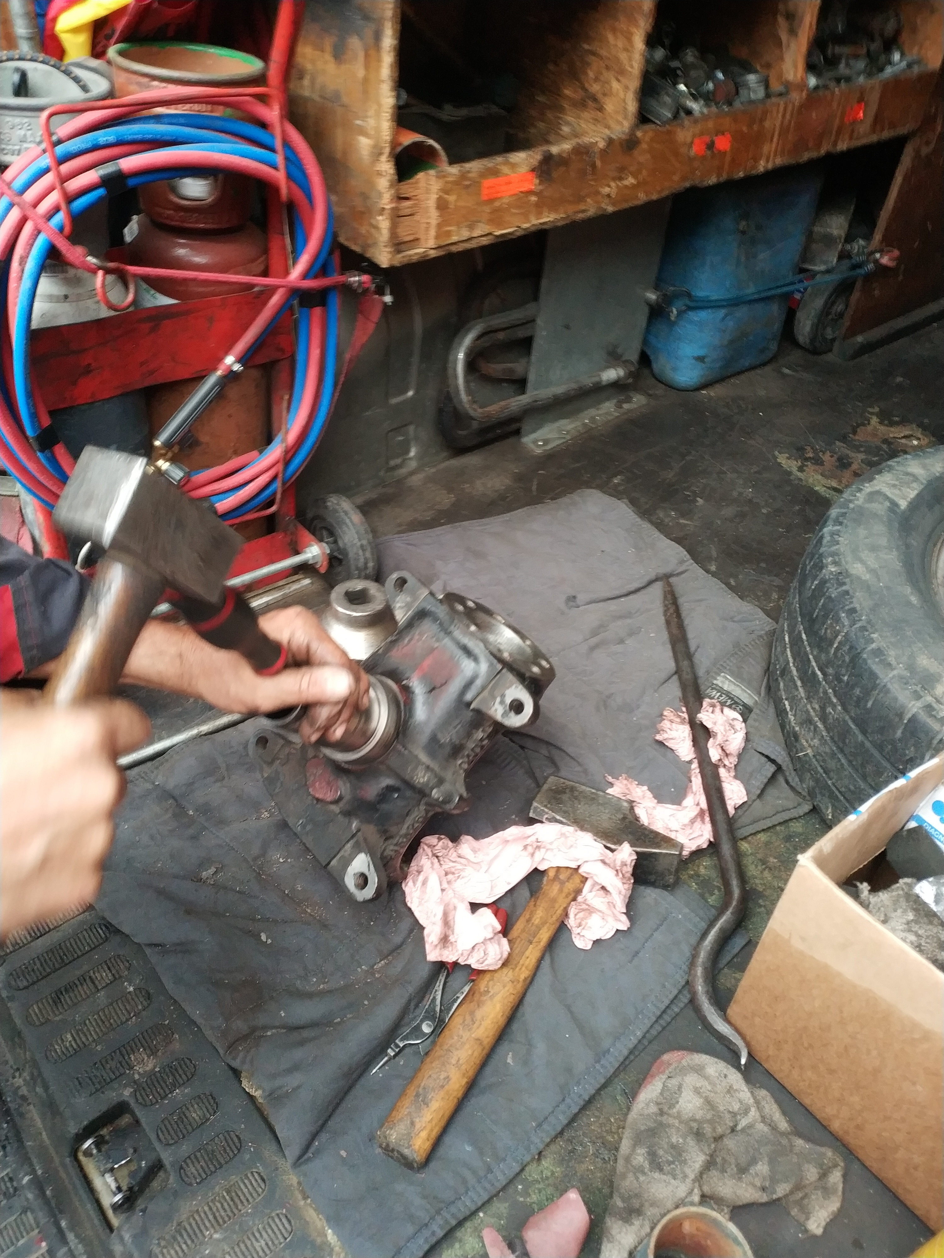5) Démonter le carter du pont, sortir dans l'ordre : circlip, arbre, roulement, joint spi, joint cache poussière. Ici tout a été remplacé sauf le circlip. Le roulement était encore bon, mais il ne coute pas cher et si jamais faut le changer il faut tout démonter...