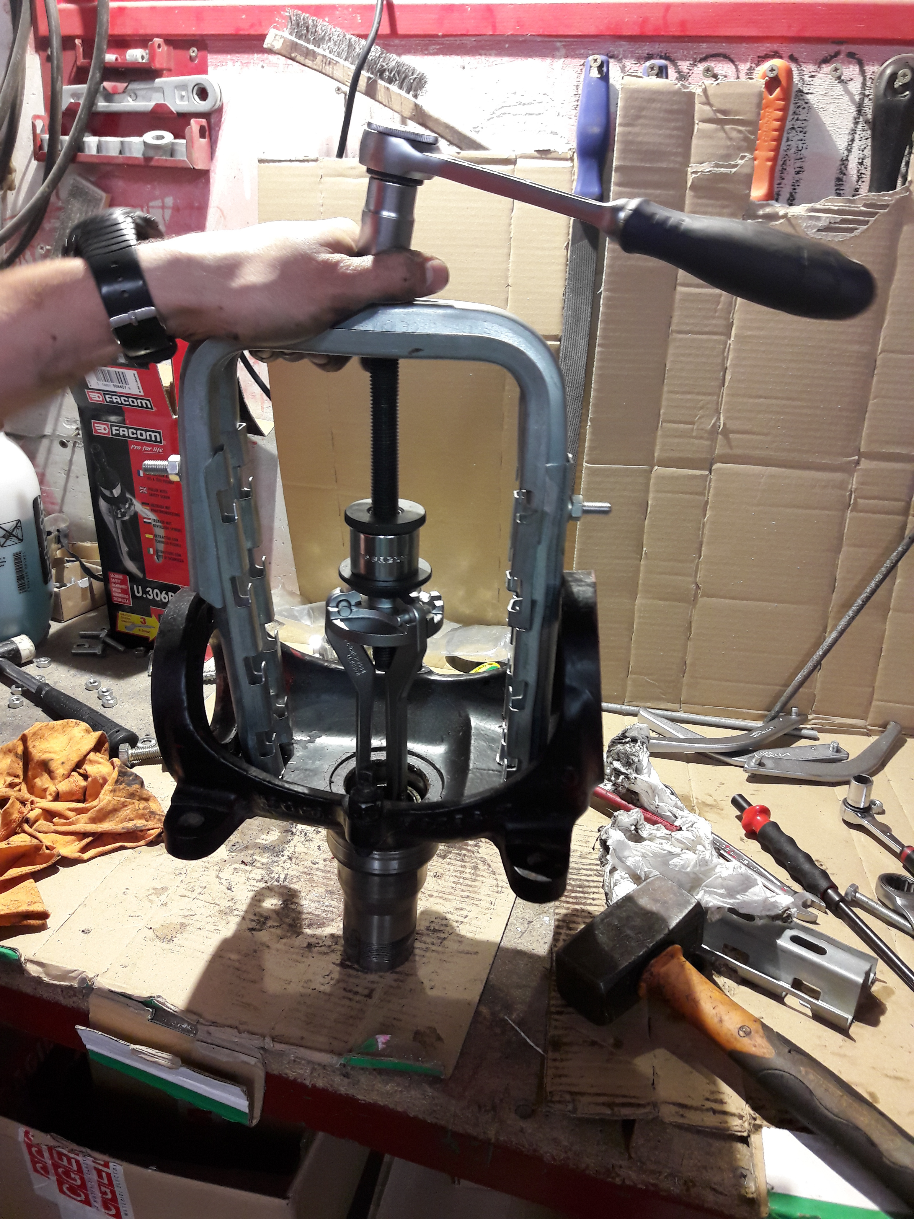 2) On démonte l'écrou de moyeu avec l'outil spécifique (il y a un tuto pour le fabriquer).