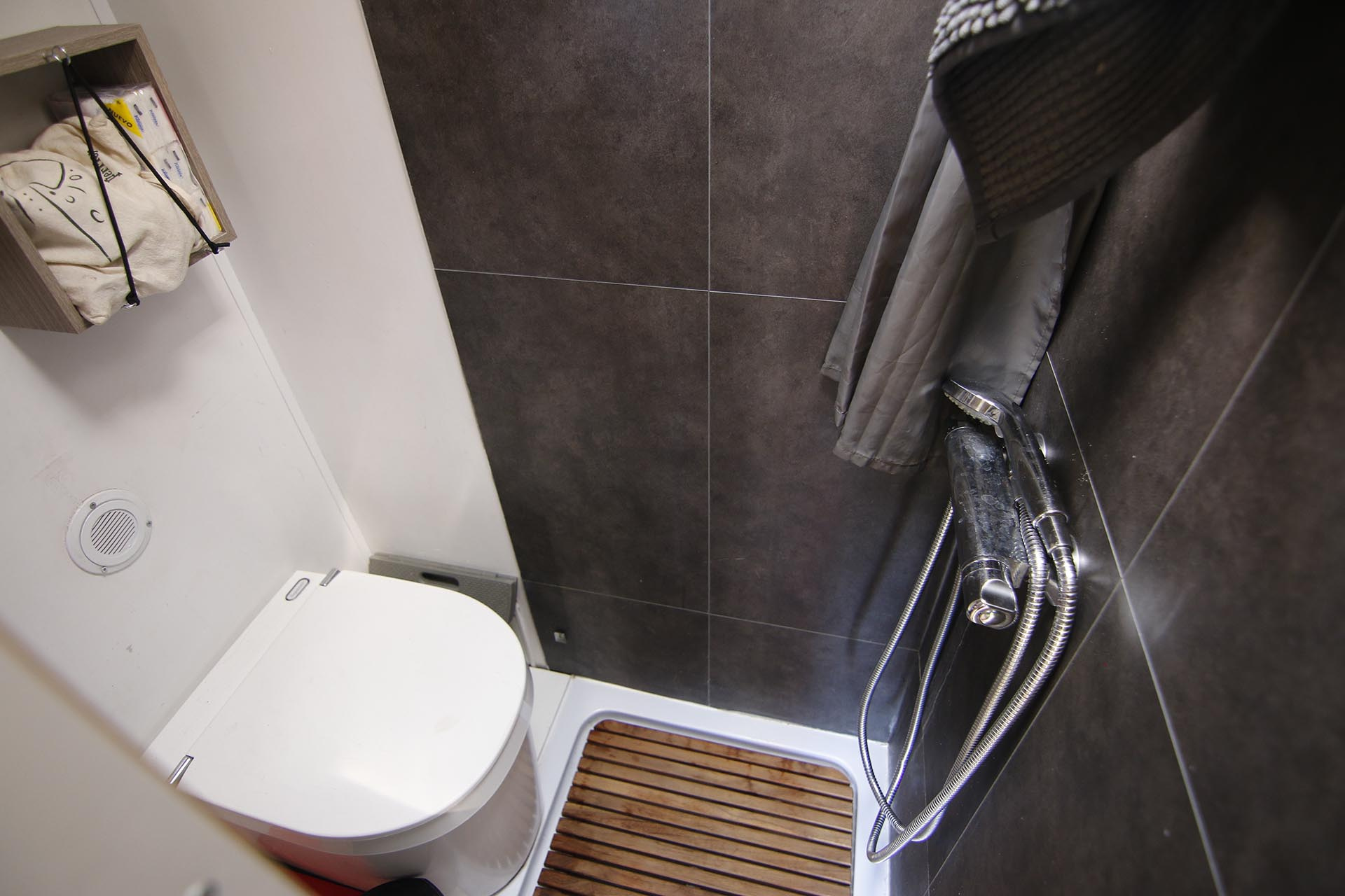 • Salle de bain avec douche, WC (sec à séparation, Separett Tiny) et lavabo