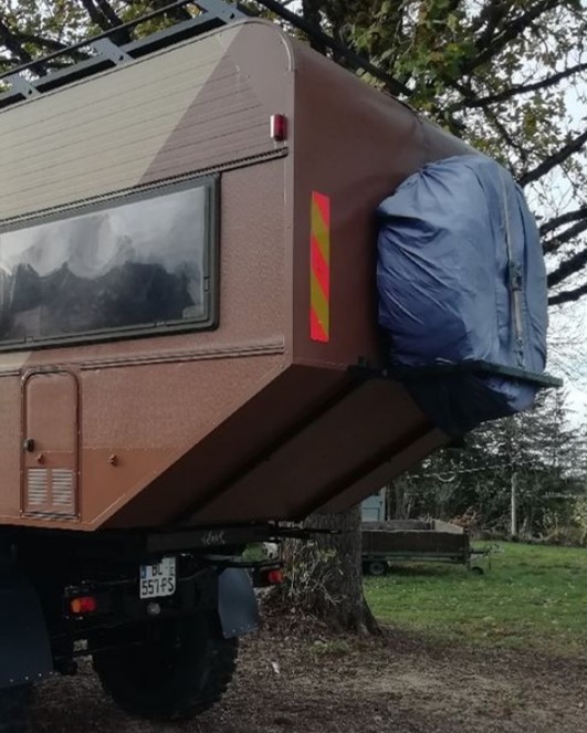 Particularitée. C est un camion benne. Ce qui lui permet ce carossage un peu plus grand que le barré rouge. La caisse bascule grace a un verin hydraulique. Pratique pour se mettre de niveau. Cela permet aussi de fair la mécanique et surtout de pouvoir toujours basculer la cabine malgrés la capucine de la cellule. Niveau cellule tout l aménagement est neuf. Il est equipé d un lit 2 places fix a l arriere et un un autre lit 200x 140 a l avant retractable. De lit une place a 2 au dessus des banquettes donc 2 grand lit fixe sans toucher au salon. Toute la sellerie est neuve réalisee par couturiere pro. 250l d eau propre. 200 l d eau usee sous le camion. Sonde d eau. Remplissage ext. Pompe shurflo. Cuisine gaziniere. Evier. système gaz tout cuivre avec vannes pour chaques équipement. Trappe ext 2 bouteilles 13kg et rangement en sup. Toutes lumieres camion leds. Lumieres leds ext. Store banne james baroud. Frigo compression avec partie congel separé 200l(format maxi et qualitée de frigo grand luxe). Salle de bain toilettes chimiques haut de gamme chasse d eau et niveau led. Douche spacieuse. Gros système electrique 660watts de solaires. Regulateur victron avec Bluetooth et 440amp de batteries gel victron. convertisseur 12 en 220v victron pure sinus 1200watts. Il ya aussi une galerie galva sur le toit. Bref je me perd tellement il y’a a raconter. c est un camion pret a partir en voyage.