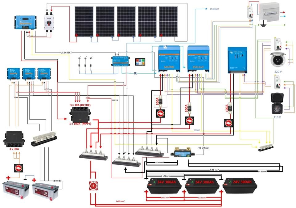 Prévoir aussi beaucoup de ventilation pour la soute car avec toute cette puissance installée, cela va chauffer pas mal et l'électronique vieillit beaucoup mieux à température modérée. Victron annonce d'ailleurs ses performances pour t=25°C.
