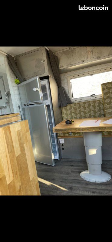Cellule de 3,1m x 2,3m h 2,25 avec tente de toit s’ouvrant dans le vide côté passager. L’aménagement est neuf. Les meubles sont sont faits en inox découpés au laser rivetés et collés. Plans, assises sont réalisés en bois massif. Tables avec pieds télescopique pour couchage d’appoint.