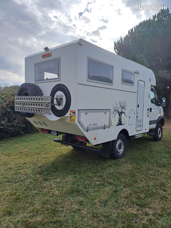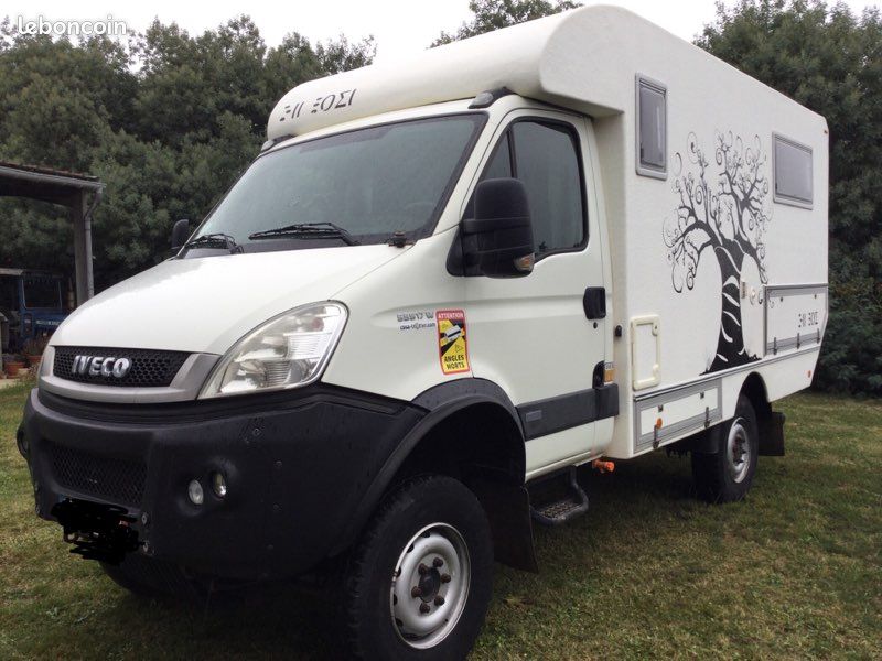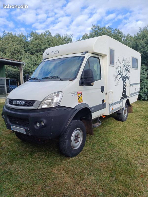 "Camping-car IVECO Daily 4x4 PL 1ère main. Diesel 3L 176ch .PTAC 5t5 Cellule CLEMENSON. Ordinateur de navigation complet. GPS,VHF. Prêt à partir pour l'aventure! Passage cellule/cabine. 3 banquettes /1 table pour 4 à 6 pers. aux repas, transformables en couchage 140x200, frigo Dometic 110L neuf, four et plaque cuisson au gaz, salle de bain et WC (neufs), séparés par cloison escamotable. Equipements : chaudière Eberspaecher neuve, 2 batteries cellule AGM neuves, 2 panneaux solaires 150W, réservoirs eau propre 240L, réservoirs GO 2x90 L (presque pleins), caméra de recul, purificateur d'eau. Compris dans le prix de vente et indissociables, d'une valeur estimée à env. 5000€ : 1 jeu complet de 6 roues, Cooper STT, bon état; nombreuses pièces mécaniques (embrayage, amortisseurs, plaquettes, filtres, etc. Diverses pièces de rechange cellule, 1 téléphone satellite. "