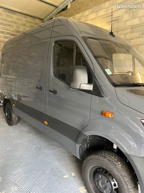 "Sprinter 4x4 L2H2 319 CDI de mai 2023 (1000 kms), feux leds, faisceaux attelage, allumage des feux auto, détecteur pluie, frein à main électrique, grand écran mbux, sièges simili cuir, volant cuir multifonctions, clim semi auto, BVA/séquentielle 9 rapports. Projet d’aménagement abandonné. Prix négociable."