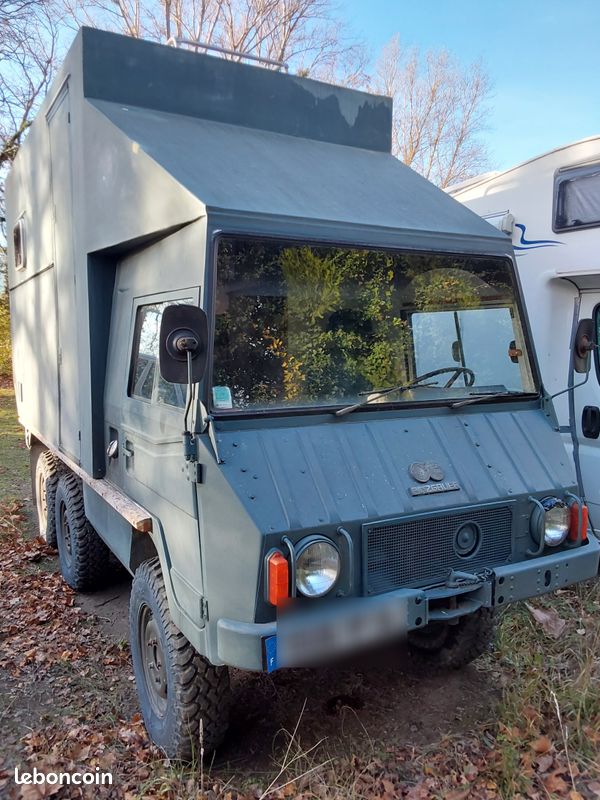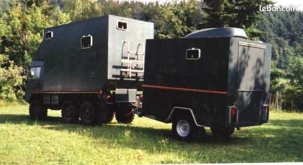 Véhicule unique au monde pour collectionneur ou baroudeur. Steyr-Puch Pinzgauer 6 roues motrices (type 712M) de 1973, 30.000 kms, transformé en camping-car par un chantier naval en 2004 avec sa remorque transformée aussi, permettant rangements et couchage (PTAC 1800kg, permis E). Moteur essence simple 2,5L refroidi par air, 90cv, inusable , avec 2 carburateurs, réservoir 150L, 80 kms/h max. Carte grise CTTE collection.