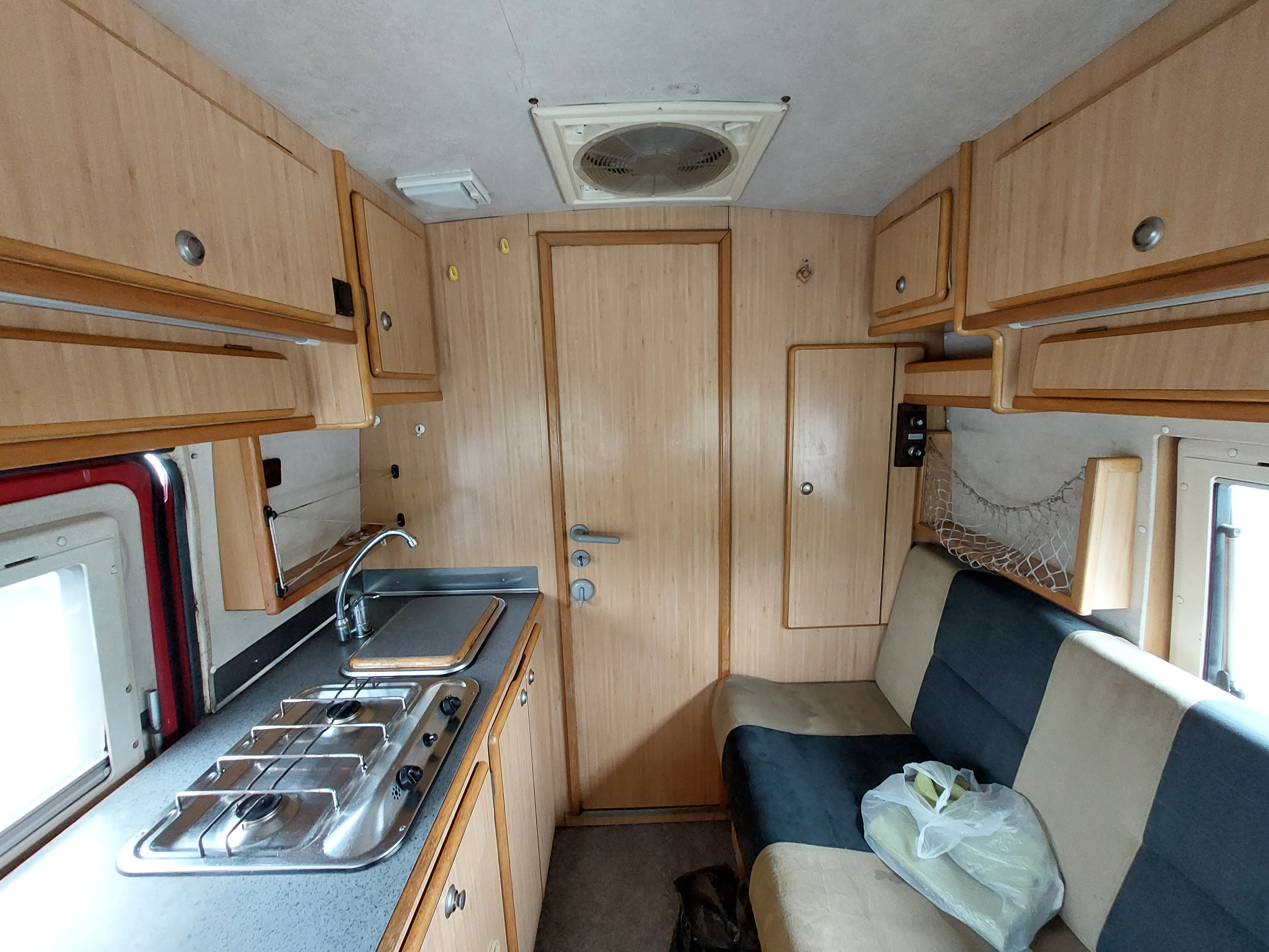 Vue dans la cellule, avec le même système pour le lit (1 place ici) et la table de la dinette qui se replie sous le lit : .