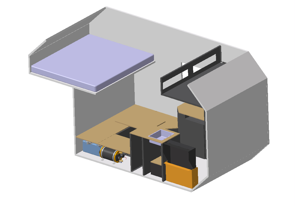 Il y a 20 ans, j'avais aménagé un combi VW T3 Syncro rehaussé (c'est pas grand) pour un voyage de 2 ans à 4 (2 enfants) en Amérique du Sud. Le cahier des charges (enfin, pour ce qui était relativement impératif) était que chacun ait sa liberté de mouvement et puisse se déplacer dans le fourgon (y compris sortir du véhicule ou y rentrer, même à l'heure du repas) sans forcer un autre à se lever ; que les enfants aient leur coin à eux (école, jeux, dessin...) ; que les WC soient accessibles aisément 24/24 (en position jour comme en position nuit) ; une douche ; rien de visible à l'extérieur du véhicule pour qu'il paraisse le plus passe-partout (ce qui veut dire 2 roues de secours à l'intérieur) ; 100 l d'eau hors gel ; chauffage ; autonomie électrique...
