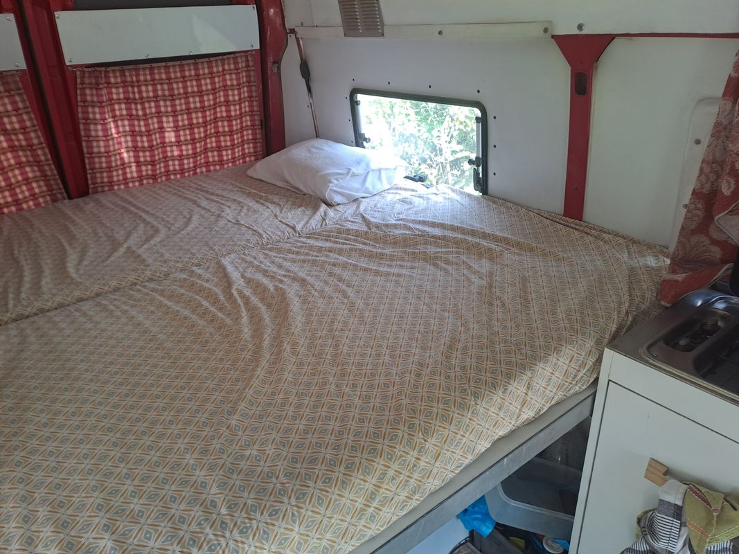 CT OK du 25/03/2024.Equipé par mes soins en fin 2022 en 2 places.Carte grise 3 places banquette origine dispo.Couchage en transversal.2 matelas en 80x184cm.Meuble cuisine avec réchaud 2 feux et bac évier avec mitigeur eau chaude froide.Micro onde 220V alimenté par convertisseur 3000watts.