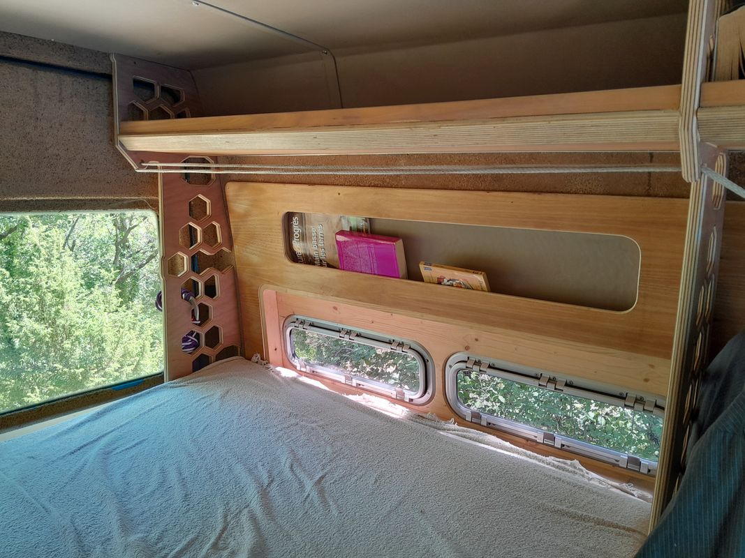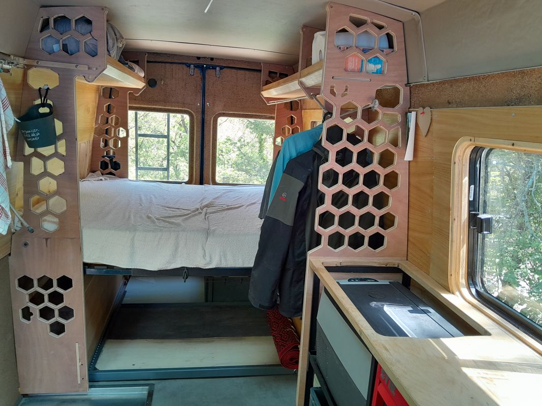 pour le camping un aménagement modulable qui permet de garder une bonne capacité de rangement une fois le lit rabattu en deux .deux batterie , un convertisseur 1000w sérieux
