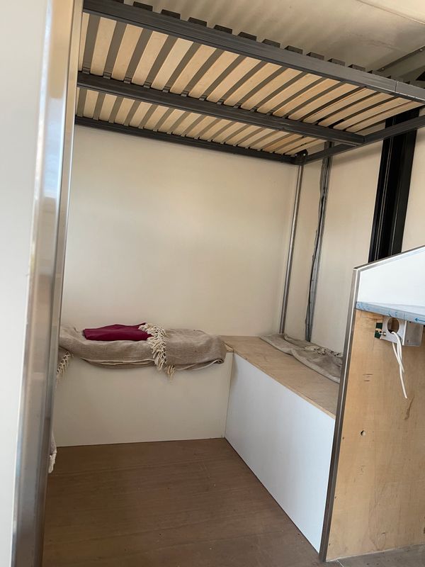 Un passage entre la cabine et la cellule permet facilite la circulation. La cellule est composé d’une douche et d’un WC broyeur , Le lit est suspendu électriquement- un espace cuisine au gaz 2 feux, grand évier avec nombreux rangements et un espace repas 4 places.