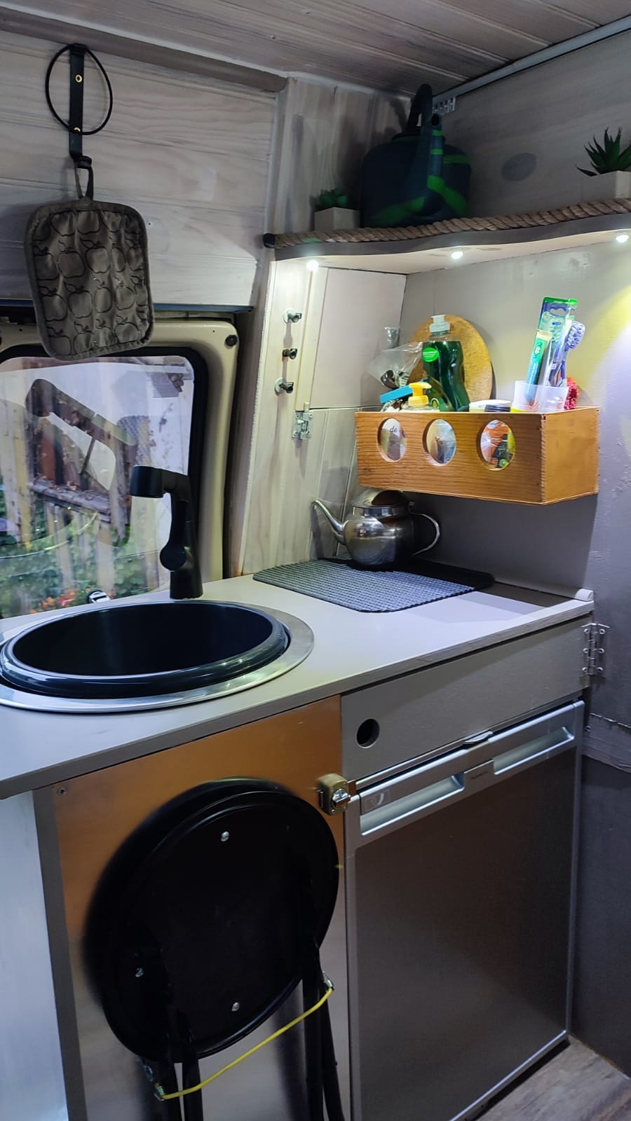 Aménagement intérieur : Frigo Dometic 90l tropicalisé (freezer), évier avec robinet douchette, plaque induction nomade avec ses rallonges, lit transversal 140x 185 , éclairages leds, ventilateurs, prises USB et all cigare, prise 220, aérateur régulé Maxfan, chauffage webasto ( pas chinasto !) sur réservoir indépendant, réserves eau sur bidons 20l ( modularité et facilité d'approvisionnement et vidage ), toilettes sèches boxio dans placard dédié, nombreuses soutes et très grands tiroirs.