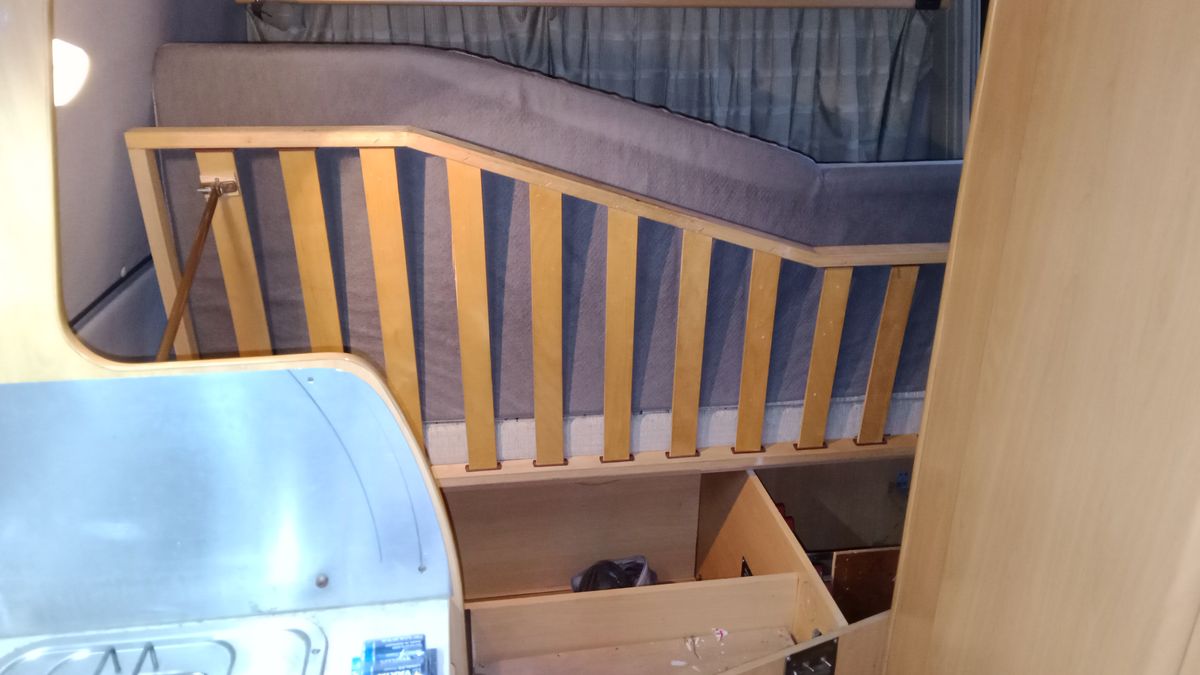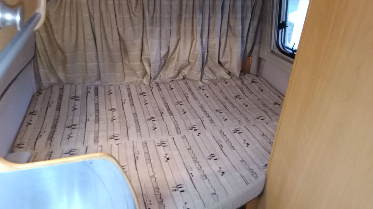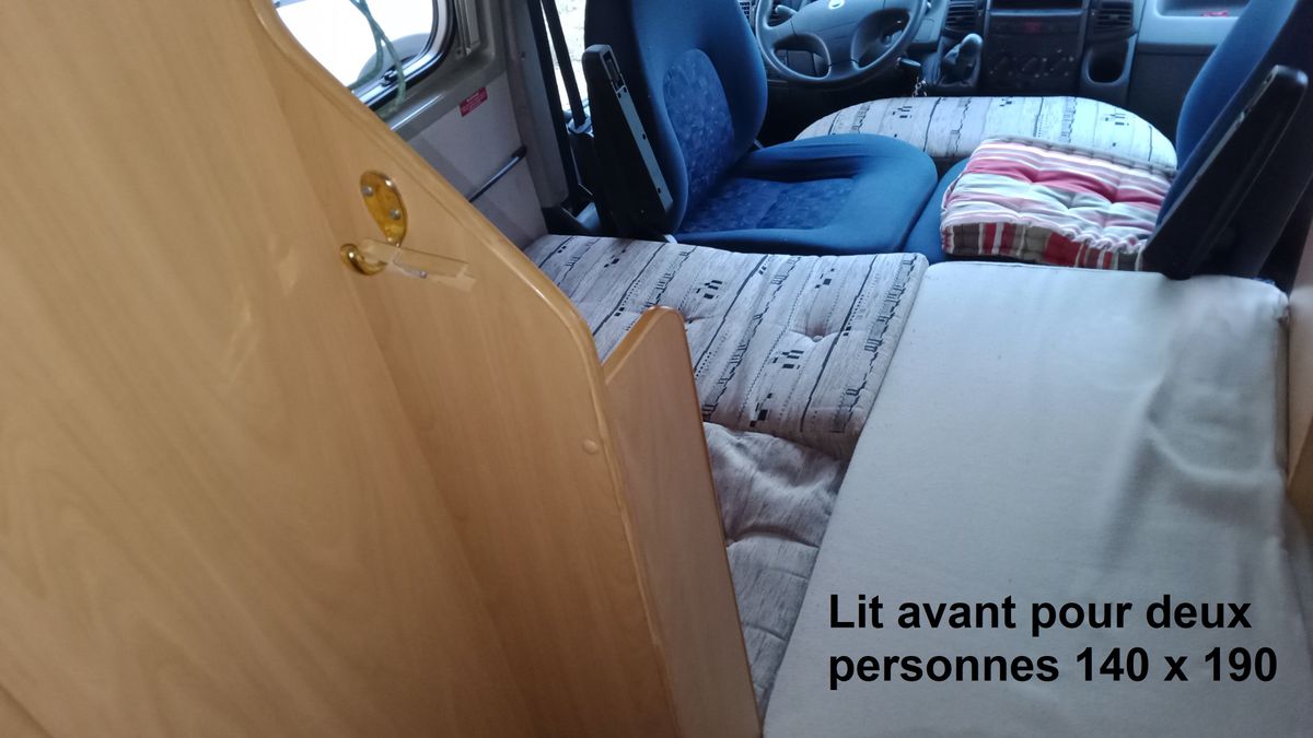 Le lit transversal permanent mesure 140x190. Très confortable car sur sommier à lattes. Le lit dinette à l'avant, initialement prévu pour un grand enfant a été transformé par mes soins en grand lit de 140x200 avec, pour seul inconvénient, le partage du pied du lit avec le volant. Cette adaptation était proposée par des artisans à l’époque. Cela fonctionne très bien depuis 2007.