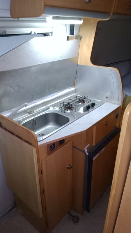 Cuisine : très classique : deux feux gaz sur bouteilles 13 kg ou malice 6kg avec inverseur automatique pour ne pas tomber en rade. Frigo de 100 litres à compression en 12 volts uniquement (le must). Il a vingt ans mais fonctionne toujours aussi bien. C’est un Thedford.