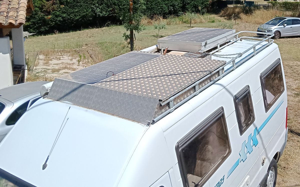 Equipement électrique très performant avec 2 batteries auxiliaires neuves (au lieu d’une seule) alimentées par 2 panneaux solaires, certes anciens, mais encore très efficaces. Un seul des panneaux suffit à alimenter le frigo.