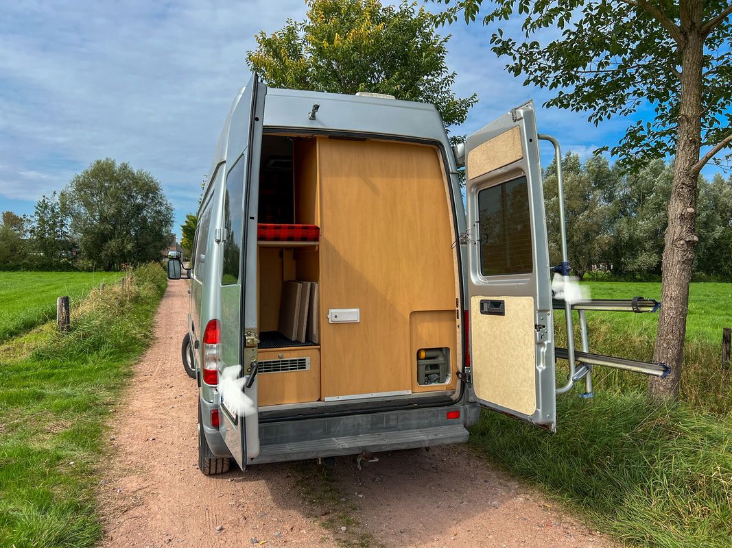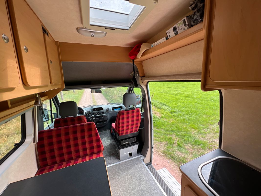 Transformation professionnelle avec couchage pour 3 personnes + lit d'appoint/hamac dans la cabine. Pendant la transformation, des toilettes chimiques, une cabine de douche, une cuisinière Dometic avec 3 brûleurs, un évier, un réfrigérateur Waeco, de l'eau courante, un panneau solaire, un onduleur, un chauffage de stationnement Webasto, un réservoir d'eau fraîche et d'eau usée, une marche d'entrée électrique rétractable, une trappe de toit dans la douche et l'espace de vie ont été installés. Énormément d'espace de rangement.