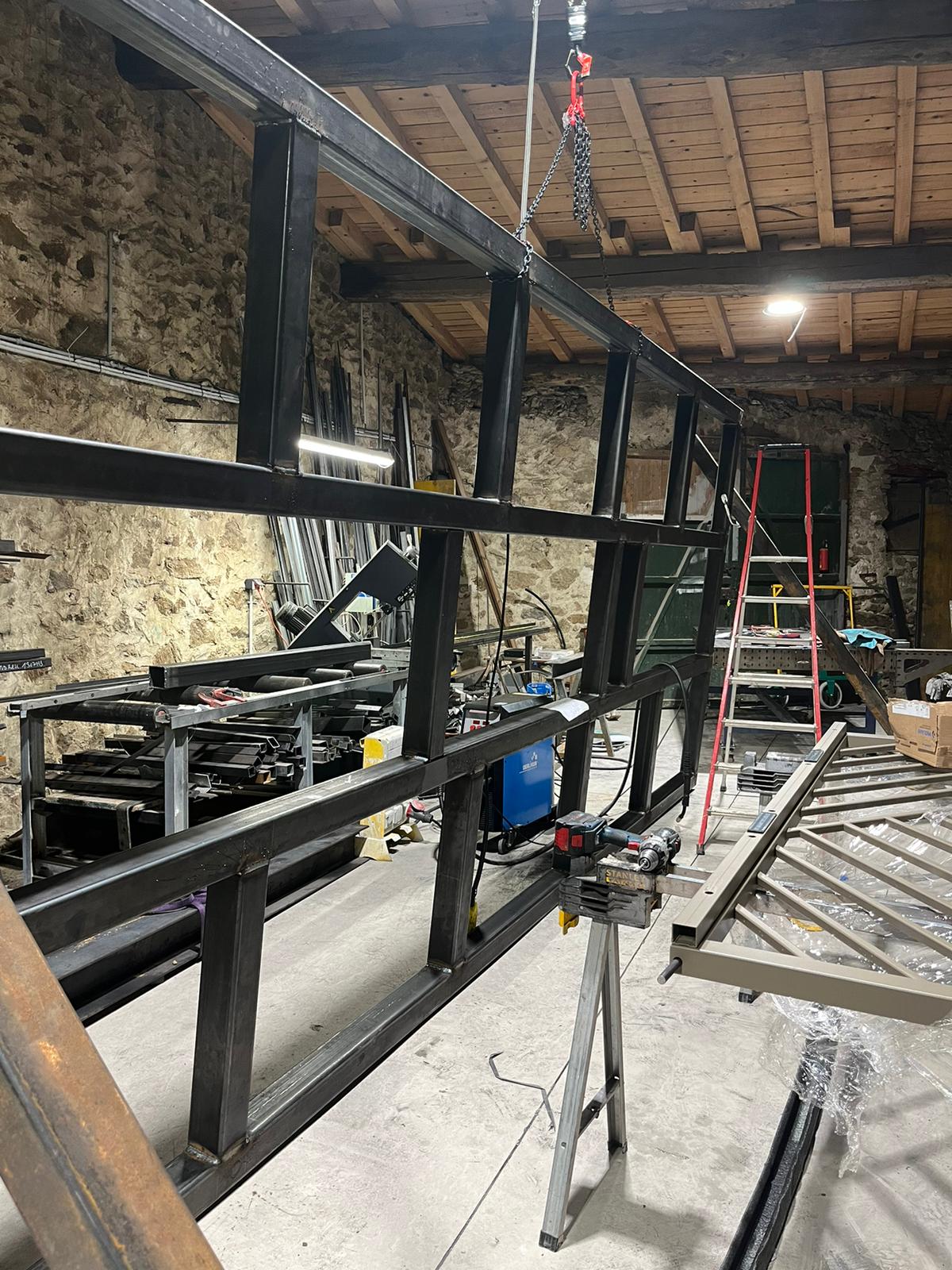 Il reste encore à mettre en place les pattes du milieux avec les silent-bloc, le ferronnier ayant profité d'un camion grue pour faire l'installation, d'où l'étayage sur les photos.