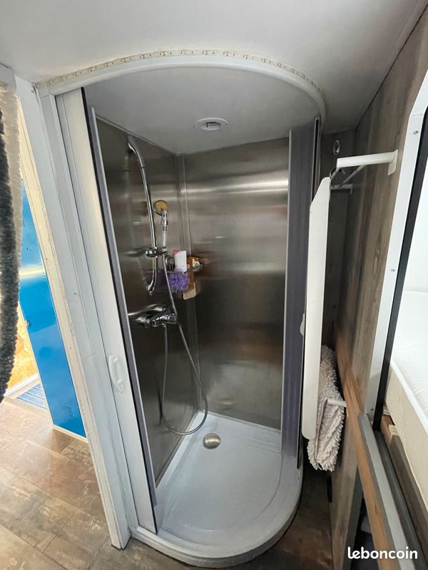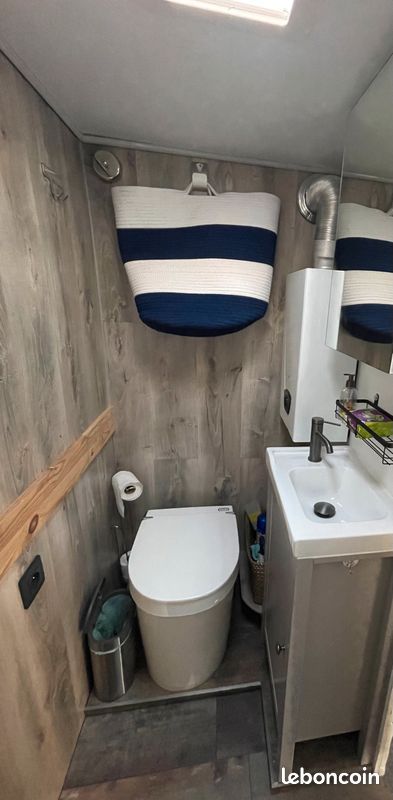 Il est équipé de tout le nécessaire pour cuisiner, dormir à 4 - 1 lit 140x190 + un autre 120x200, salle de bain avec douche paroies acier inoxydable 80cm + WC Tiny Separett avec réservoir eaux noires 50L.