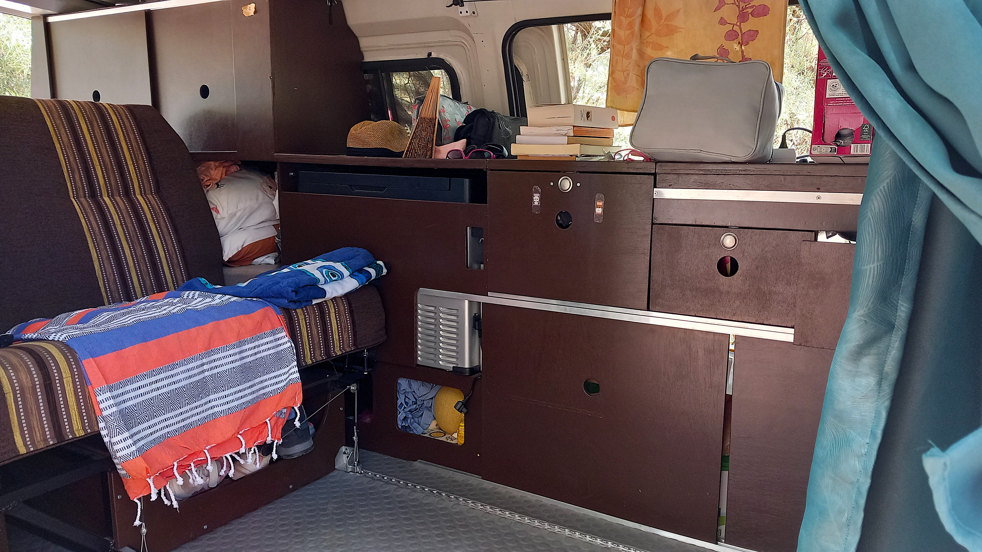 Afin de pouvoir partir pour le premier voyage de sa nouvelle vie, le bursuc a tout d’abord subit une série de réparations en urgence : système de chauffage cabine (vanne et radiateur HS), neiman, éclairage, renforcement de la banquette arrière (en bois), etc. Le reliquat de l’équipement initial, inutilisable en l’état, a été déposé. En remplacement, une ébauche d’aménagement très sommaire a été posée, déjà pensée sur le plan du concept Westfalia des VW T3 : cuisine à gauche – donc en face de la porte coulissante droite, et lit à l’arrière. La suite (banquette, rangements supplémentaires) viendra plus tard. A noter que contrairement au VW T3, du fait du moteur en position centrale, il est impossible de faire pivoter les sièges avant. On gagne en revanche un très grand volume de rangement sous le lit à l’arrière.
