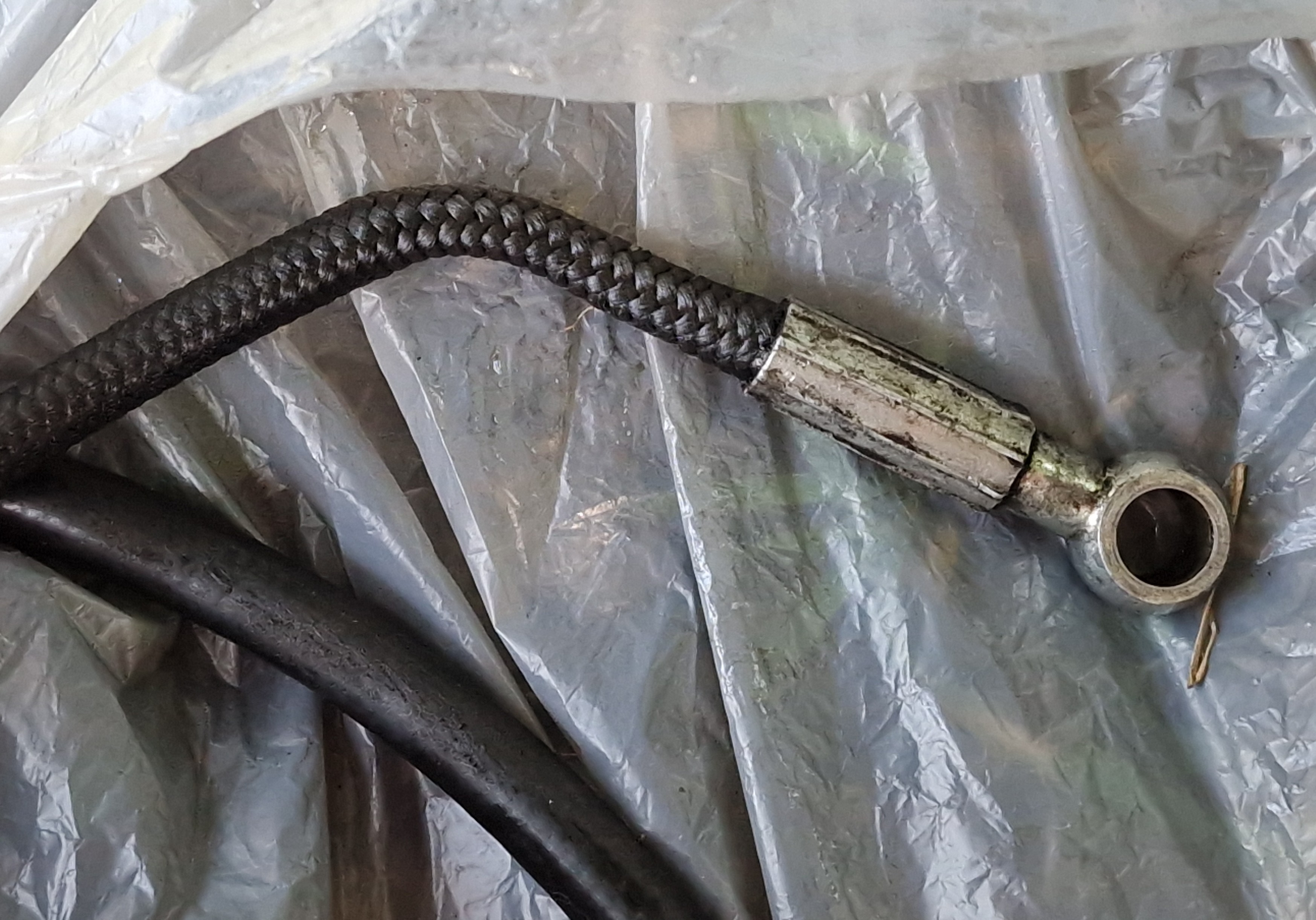 Cette durite était recouverte d'un maillage en acier tressé (merci les normes "militaires" de mon Brutt) qui "diffusait" le liquide hydraulique et rendait difficile la visualisation et la localisation de la fuite.
