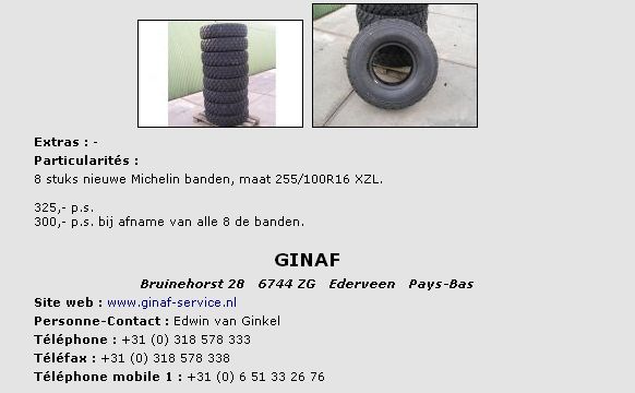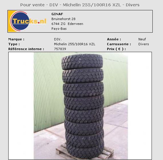 pour mémoire si ça peut motiver les troupes...et s'il y a beaucoup de monde intéressé je veux bien partager et n'en prendre que 2....et aller les chercher là bas et les descendre tous sur Paris...gerard 74 wrote:Salut , tout le monde , ça y est , j'ai craqué , j'ai acheté des Michelin XZL 255 100x16 neufs !!!en suisse because pas dispo en France