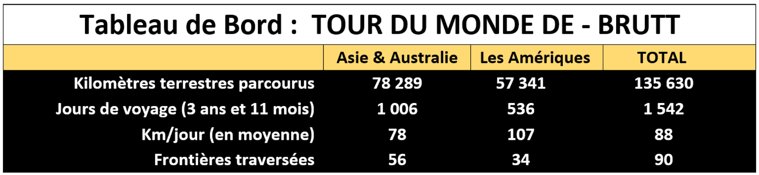 PS - Quand à moi, voici un tableau qui résume mon Tour du Monde, alors que je quitte le Mexique (pour entrer aux USA).