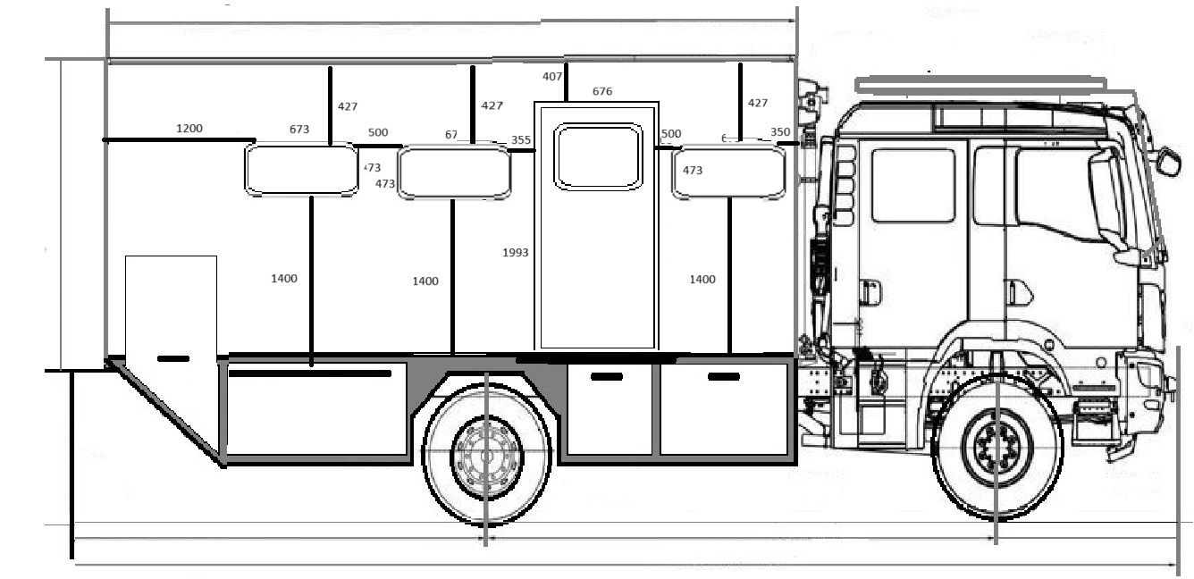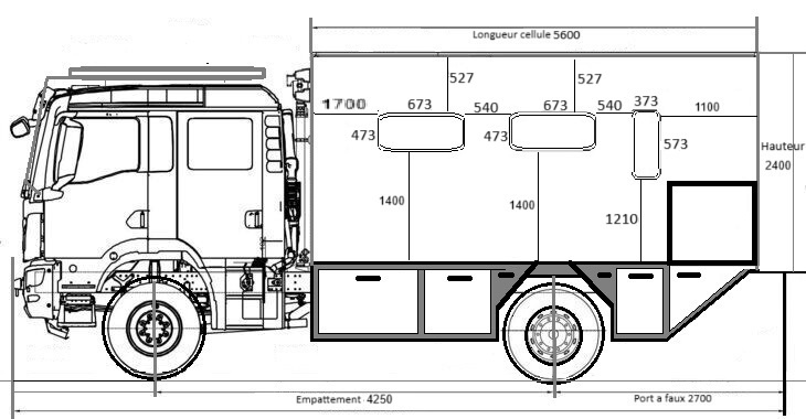 Je cherche donc à faire faire une cellule en Europe, 5600x2450x2300 avec les fenêtres , porte, passage cabine, faux châssis avec rallongement du port à faux, coffres dessous et éventuellement les réservoirs et la peinture basse raptor sur le bas de l’ensemble et normale sur véhicule et cellule.