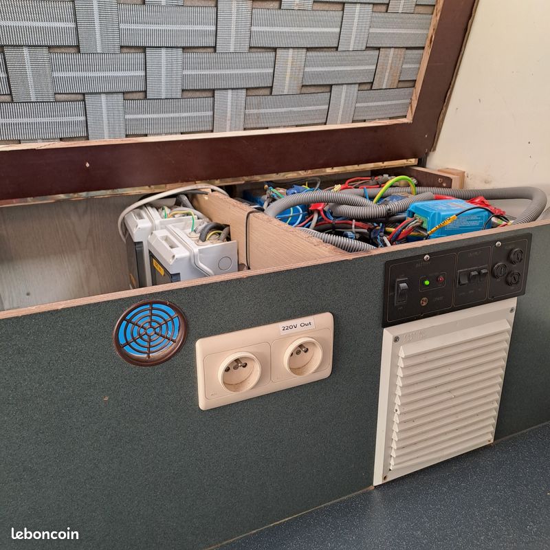 2 panneaux solaires avec onduleur Victron, 2 batteries et un chargeur.