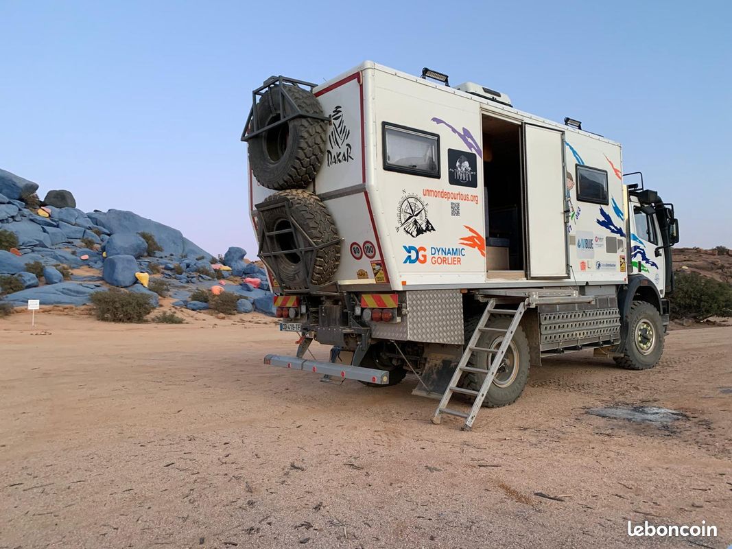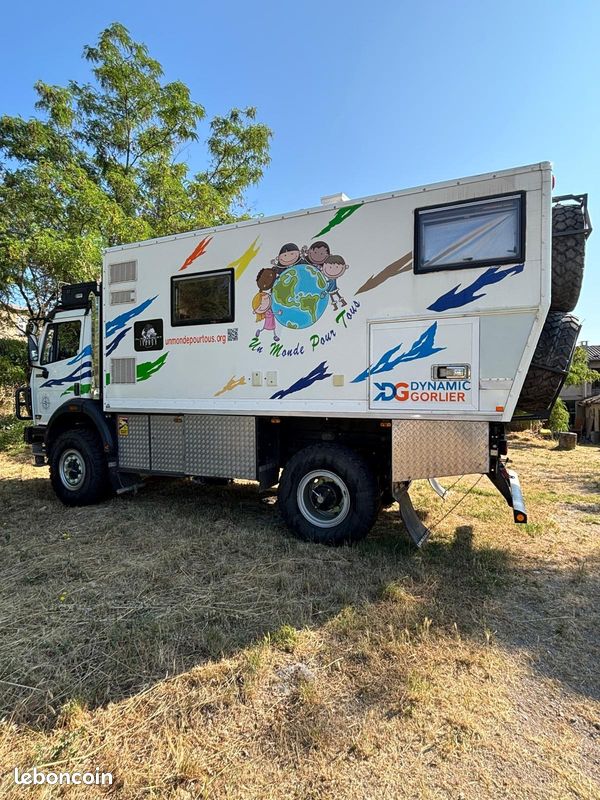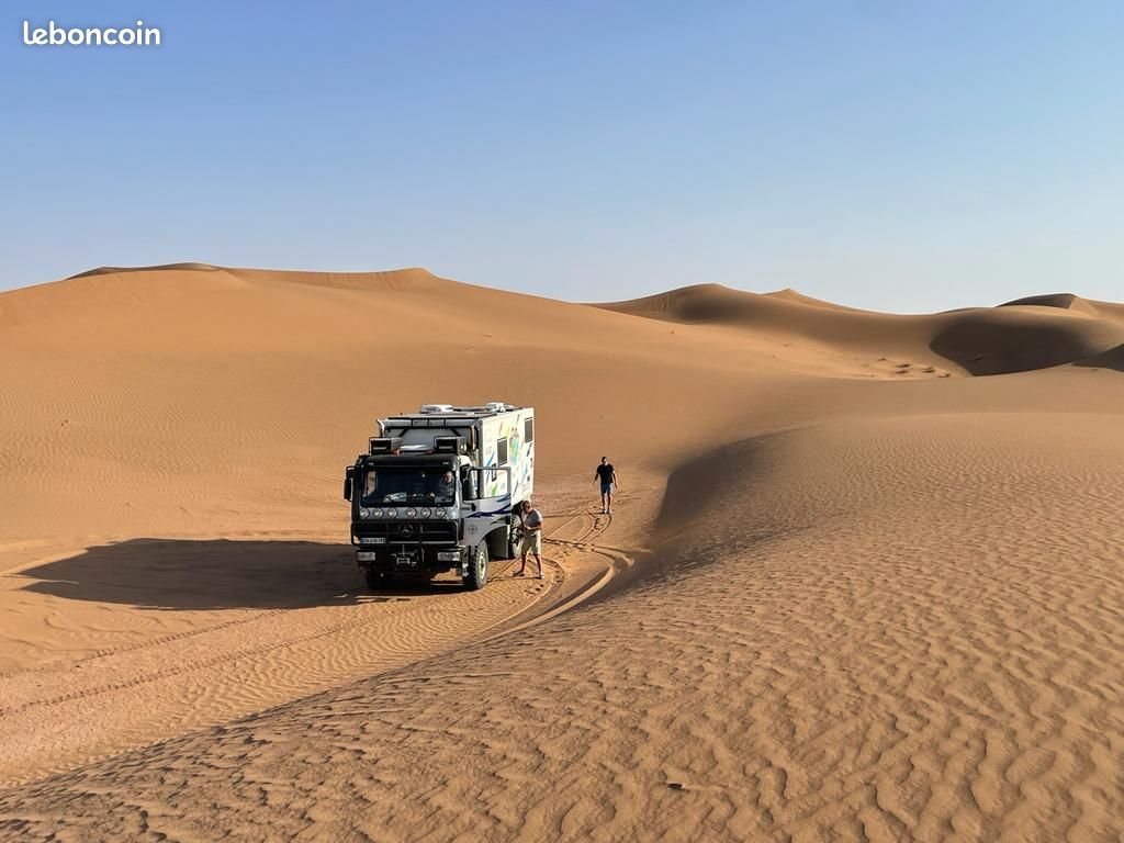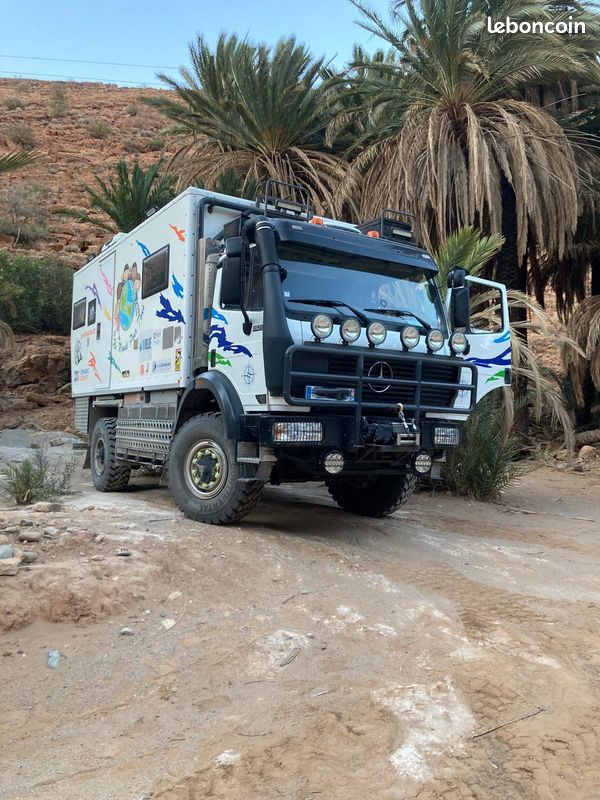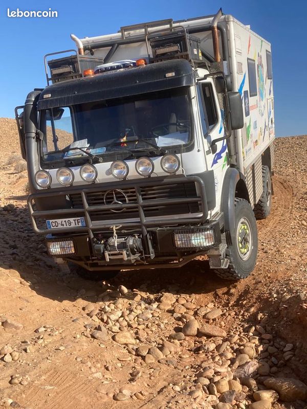 Mercedes 1929 V8 145000 kms d'origine entièrement préparée par spécialiste du Dakar, fixation double châssis, suspension compétition 8 amortisseurs Boss, gonflage et dégonflage en roulant, 2 vérins arrière au pont pour relevage, 2 roues de secours avec treuil, entièrement autonome, groupe électrogène, panneaux solaires, réserve eau 2000 litres, 1000 litres de gasoil, eau noire et eau grise, cuisine en massif plaque cuisson 3 feux, hotte, évier, four, congélateur , frigo, lit 140, WC, douche etc ...