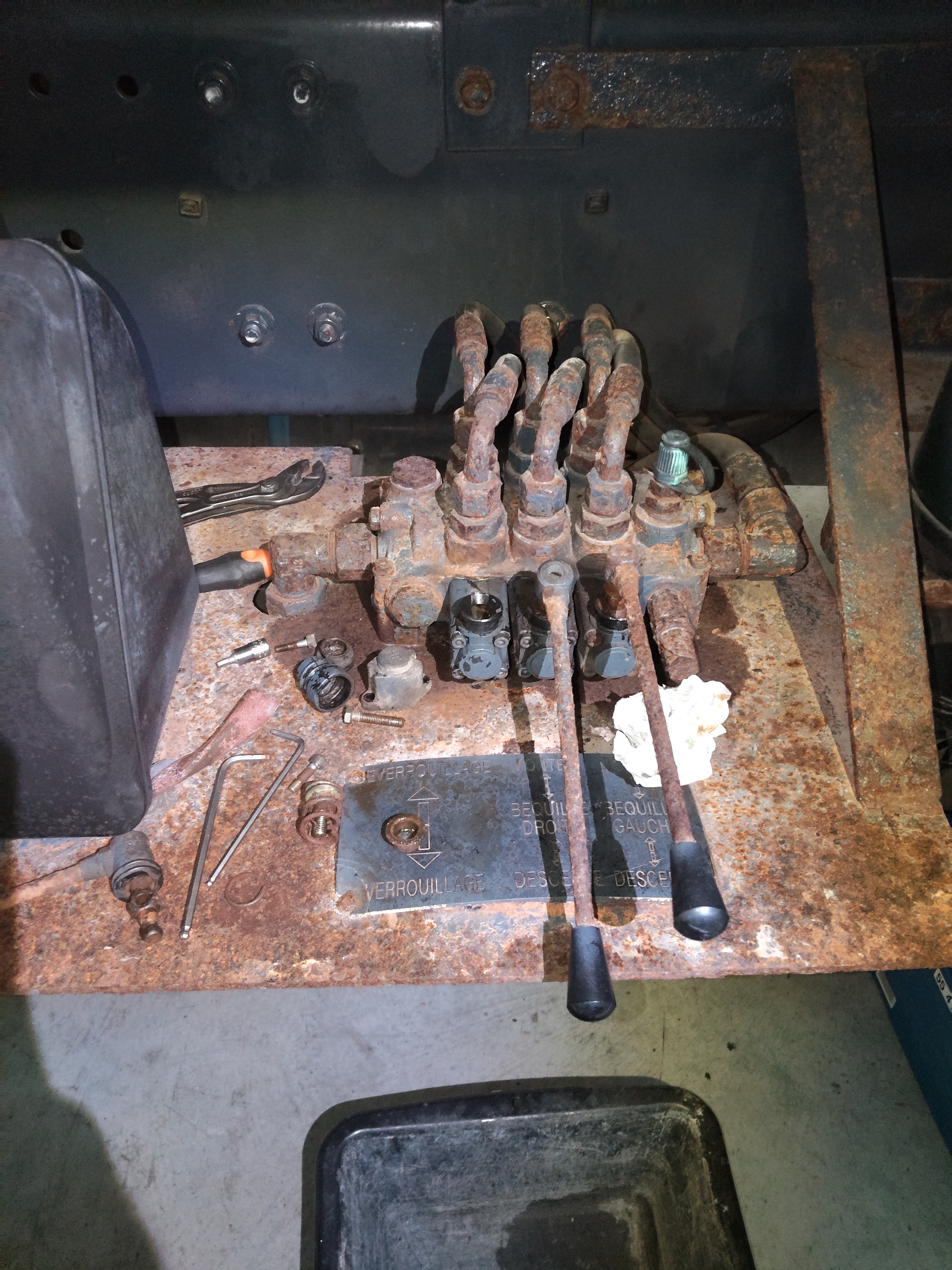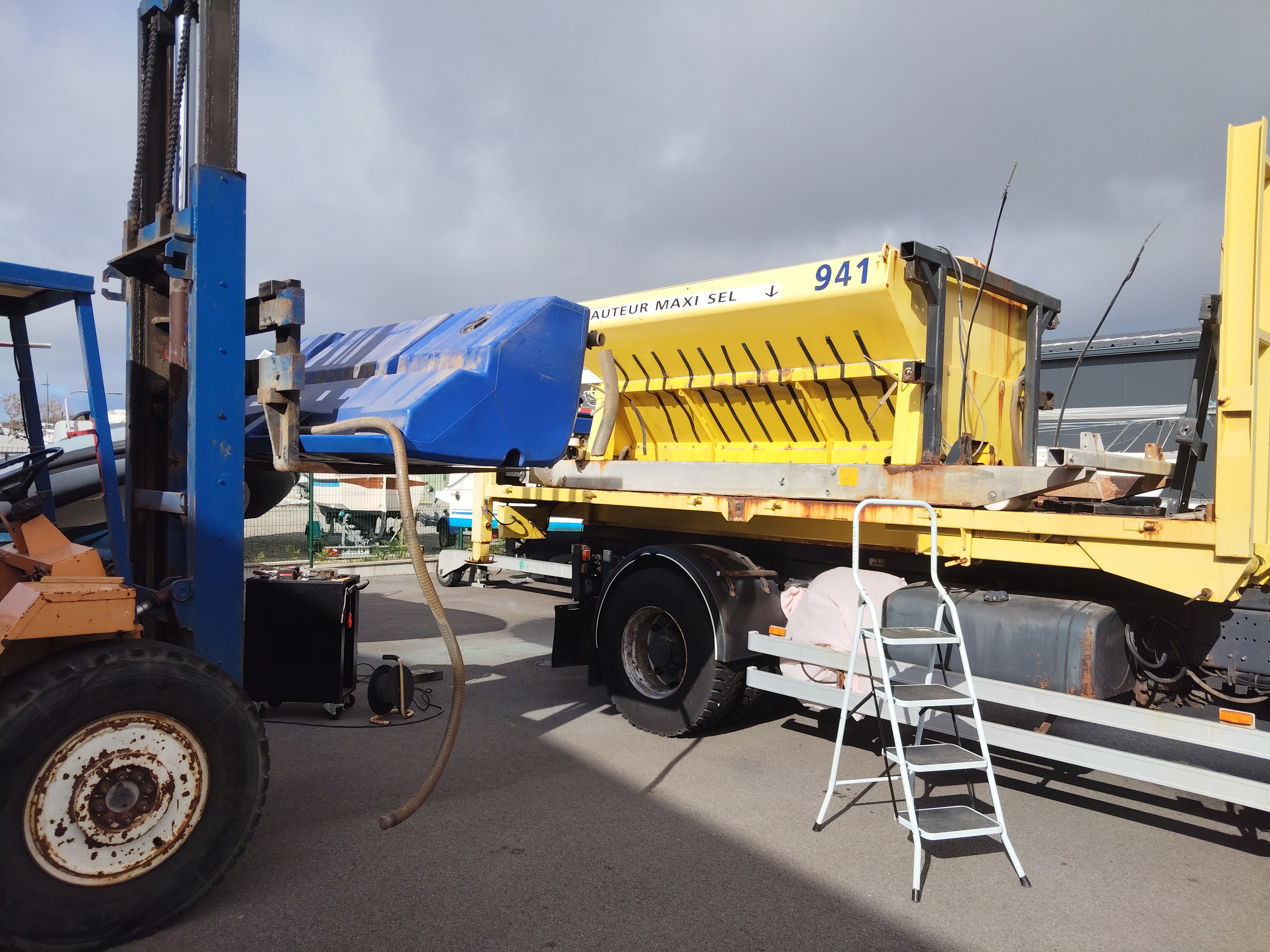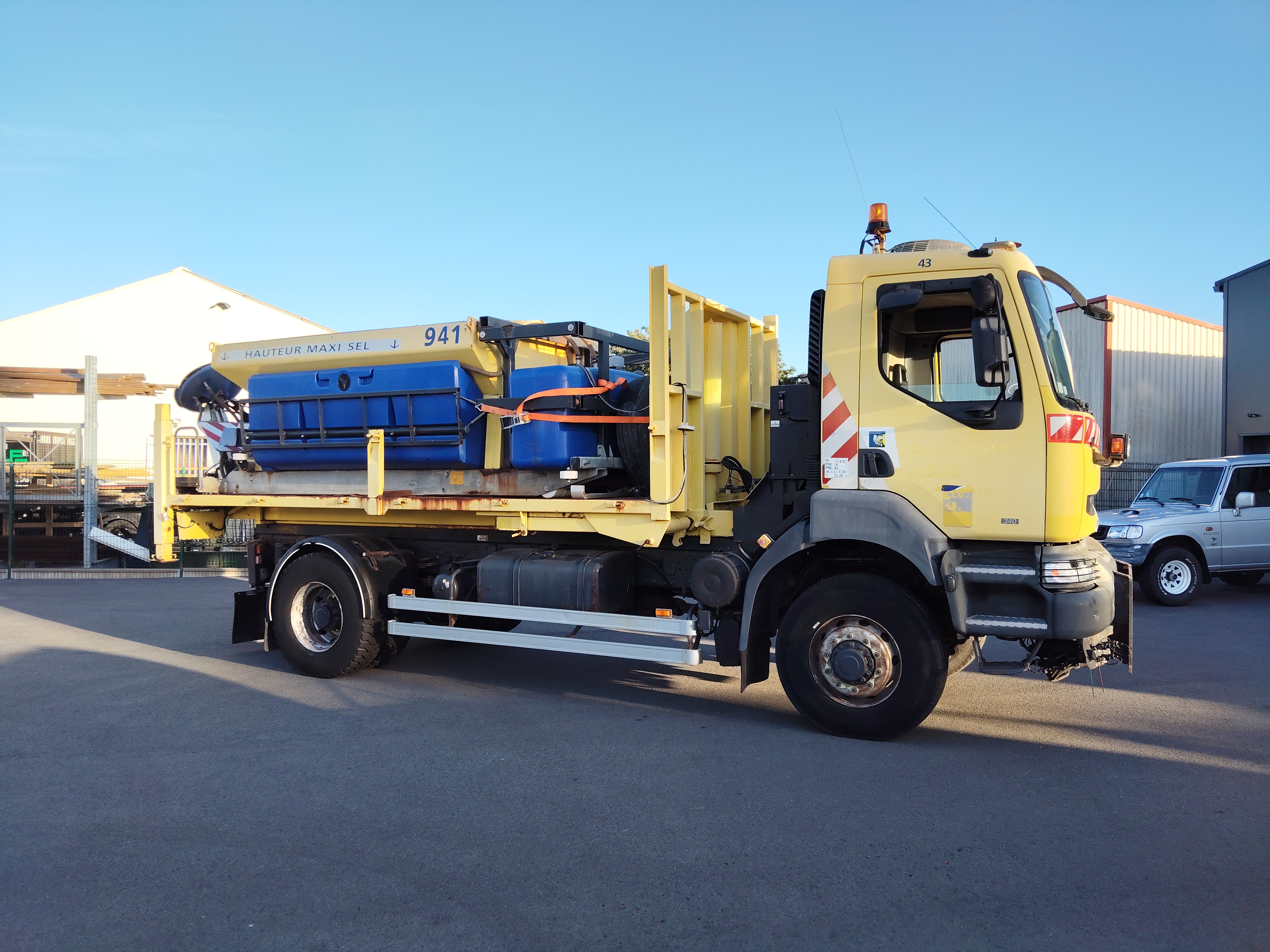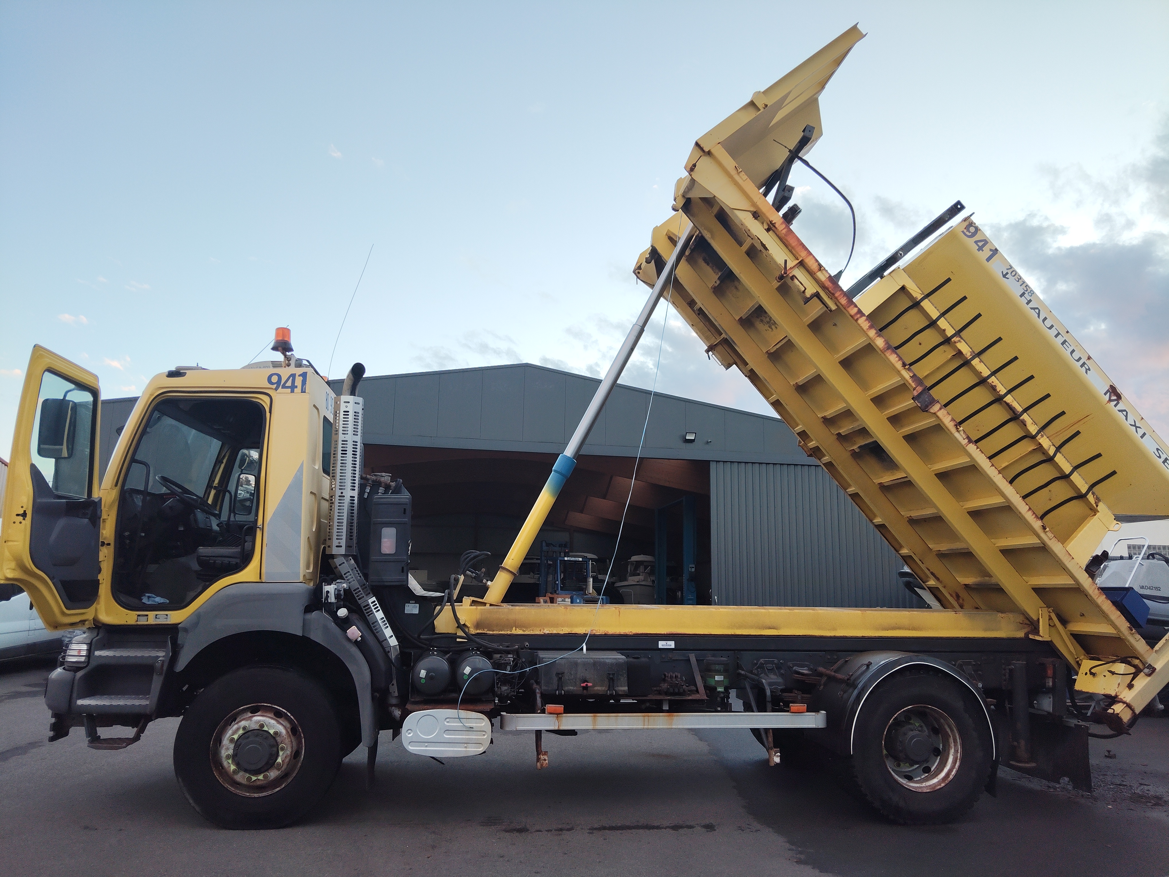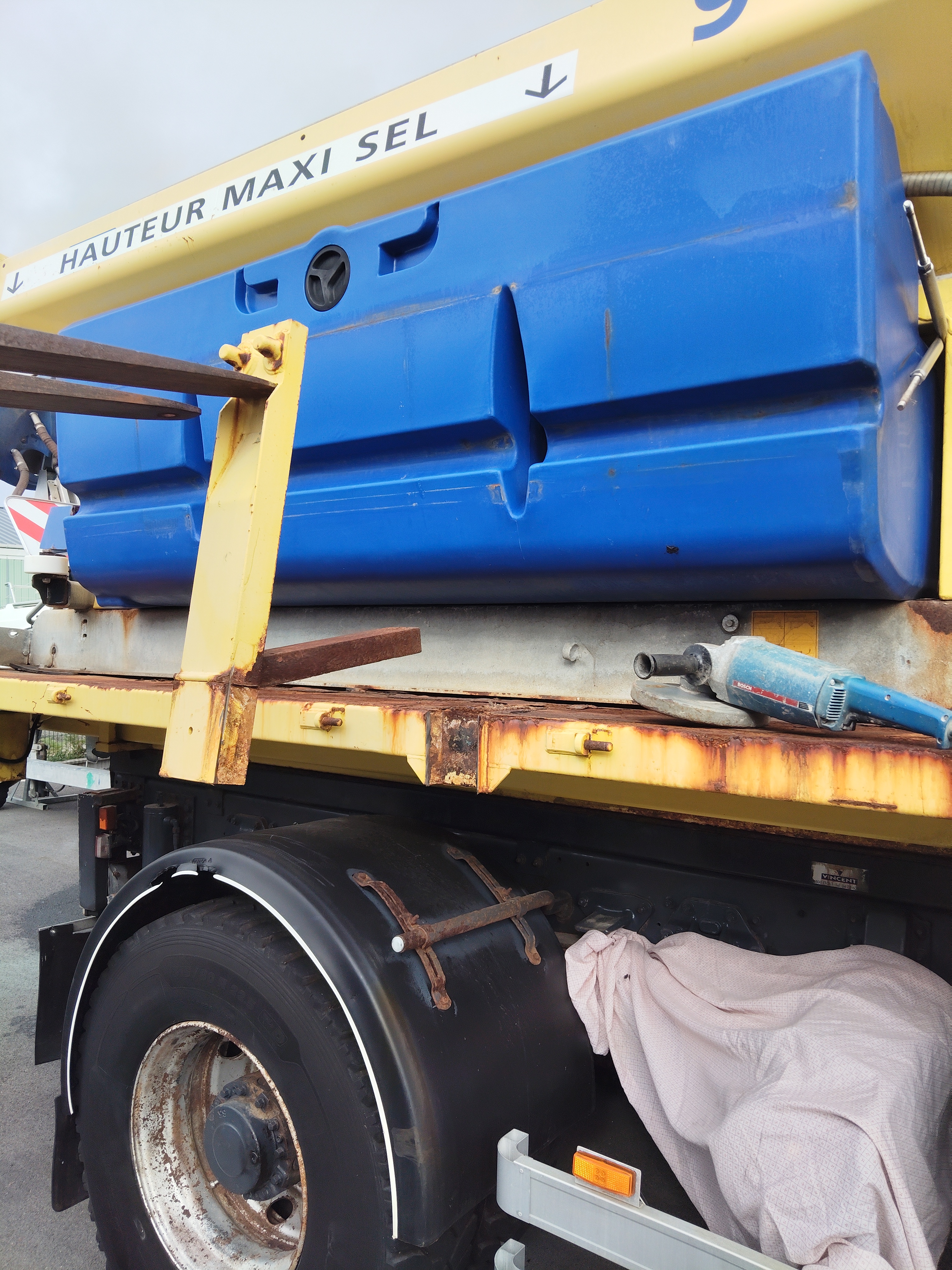 Comme les autres 4x4 il est équipé des blocages de ponts et boîte de transfert ainsi que des rapports cours, actuellement carrossé en benne amovible avec une saleuse boulonnée sur le plateau et plaque Setra à l'avant avec les sorties hydrauliques pour chasse neige (ou autre).