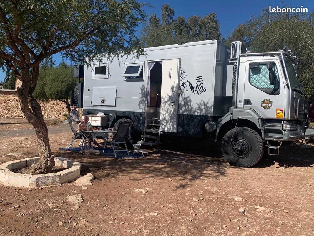 Cellule IPM MONDIA sur châssis 3 points avec passage cabine. Electricité avec 5 panneaux solaires de 540W chacun + groupe electrogène de 3000w, double vitrage de Carapace, ballon ECS, 400l d'eau propre, chauffage, climatisation de la cellule, cuisine équipée plaque induction, lave vaisselle, lave linge , refrigérateur et congélateur, TV, système de filtration eau, 2 lits jumeaux, salon en U transformable en lit double, douche et WC nautique, escalier d'accès cellule électrique, gonflage des pneus automatique