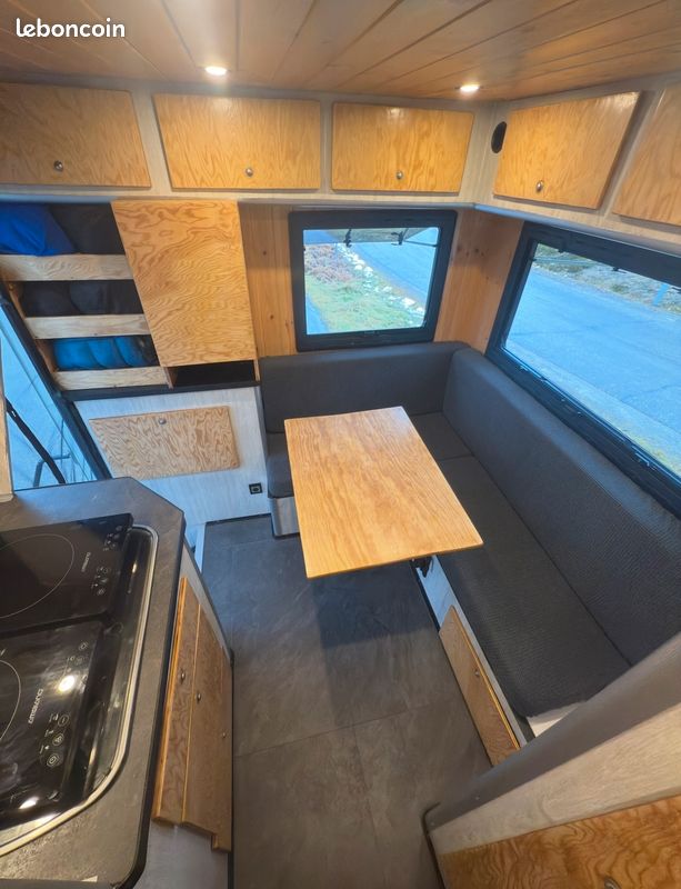 Coucher principal de 2 x 1,5 mètres. Coin repas convertible en lit d’appoint. Salle de bain avec grande douche et WC. Réservoir d'eau de 120 litres