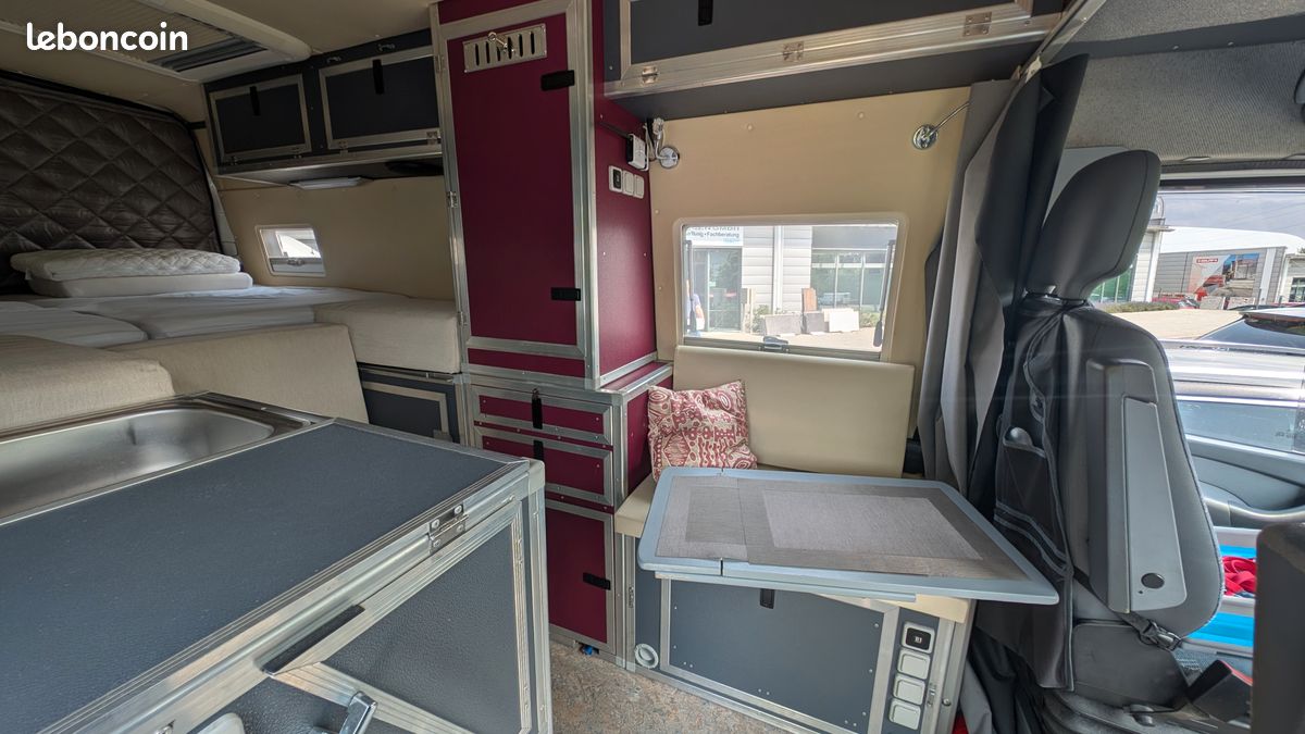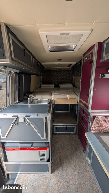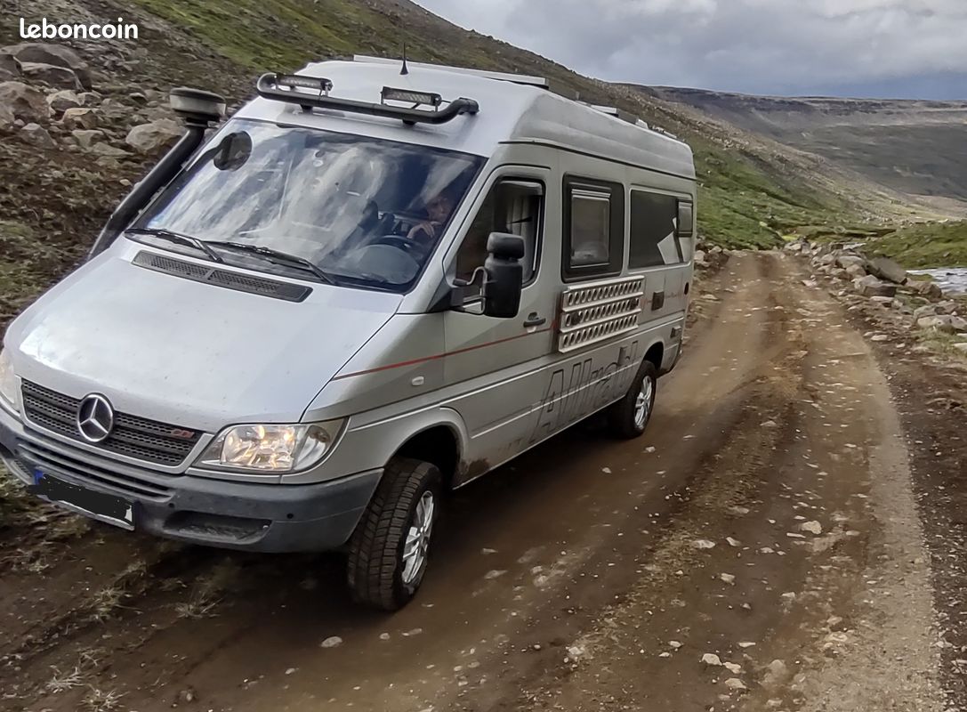 Le Sprinter a été initialement utilisé comme fourgonnette. Acheté d'occasion en 2018, le fourgon comprenait déjà le système 4x4 Iglhaut. Nous l'avons fait transformer en camping-car pour deux personnes par Desert Service et Agtar en Allemagne. Son poids a été porté à 3,8 tonnes, avec un renforcement supplémentaire des ressorts à lames et pose d'un attelage de remorque.