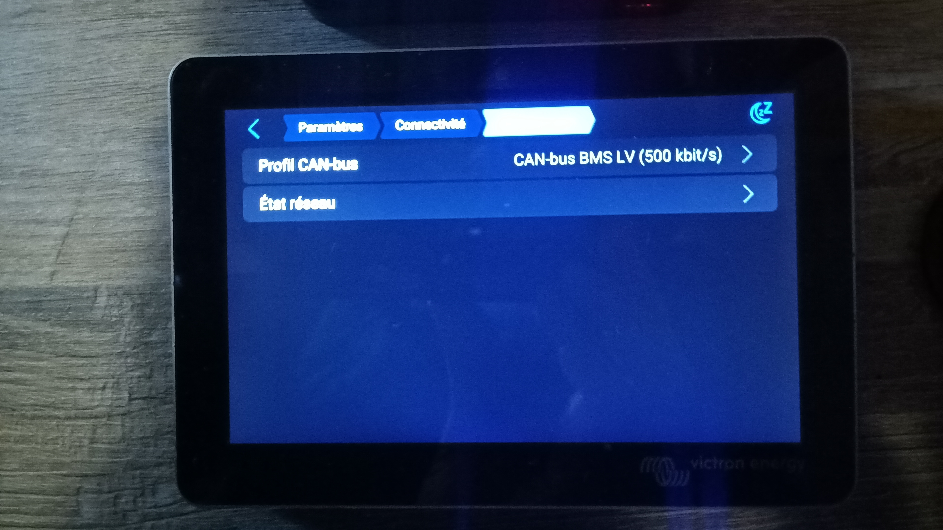 3. Changer la sélection pour communiquer en 500kbit/s Can bus BMS, paramètre > connectivité > profil can.