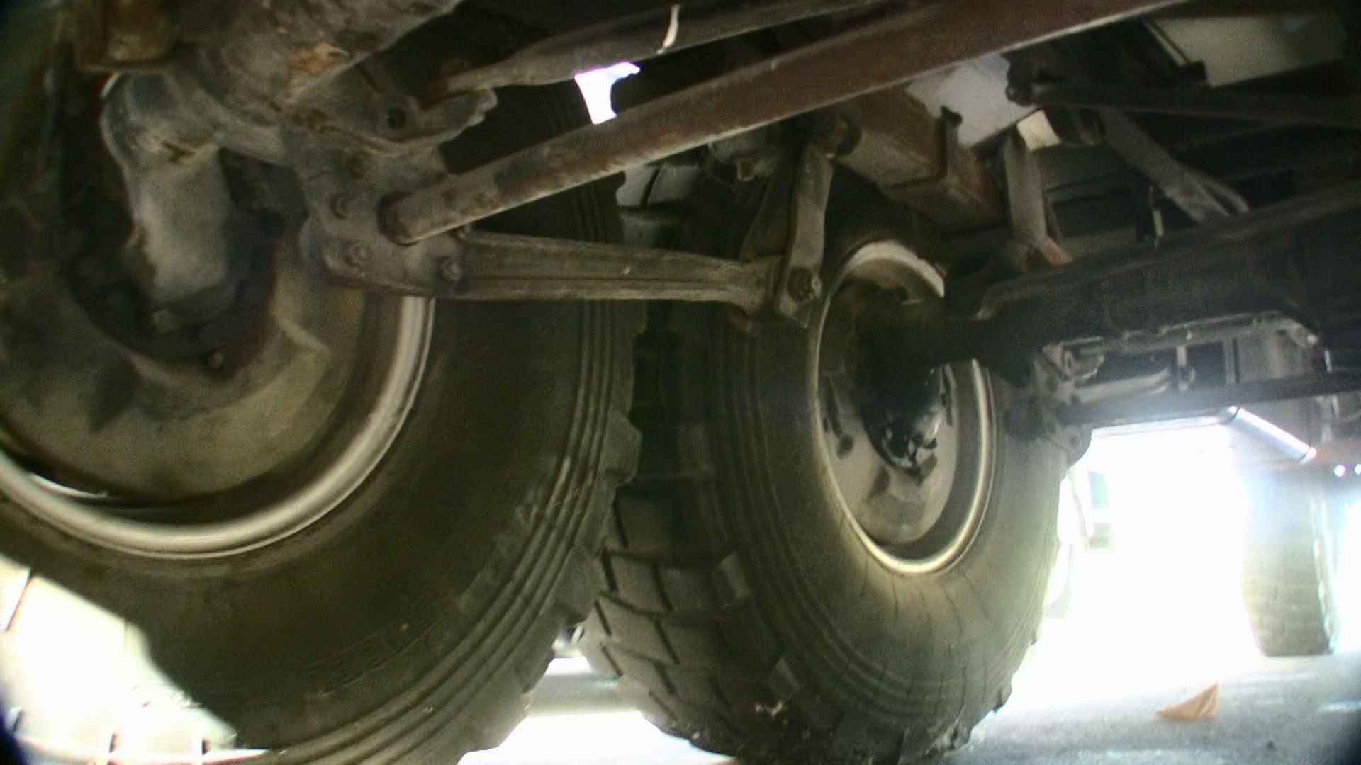 apparement ce paquet de lame est fixé en son milieu sur l'essieu arr , ce qui est surprenant : dans ce cas, il devrait être fixé à ses extrémités au châssis, (et "à l'envers" , pour permettre un débattement minimum )