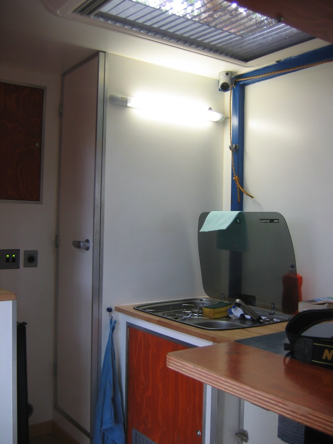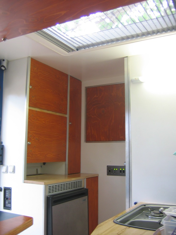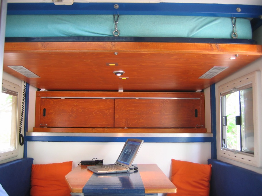 Cellule sur mesure (3,0 m x 1.7, hauteur intérieur entre 1.77 et 2.03 m), structure en tube d’acier de 5x5 cm, parois corapan 2 cm (type caisse frigorifique), armoire à habits dans la capucine, table à manger pour 4 personnes se transformant en lit avec les banquettes (100x160), lit se descendant du plafond avec sommier et matelas (160x200), cuisinière à gaz 2 feux avec évier, chauffe eau et chauffage à gaz (Truma 3400), bombonne de gaz 13 kg, frigo à compression Waeco 110 litres avec congélateur, 5 armoires de rangements pour cuisine et autres, douche avec WC chimiques Thetford dans pièce fermée avec porte, 145 litres d’eau avec pompe auto-amorçant, 45 litres réservoir d’eau usée, 3 fenêtres Seitz avec moustiquaire et store, un dôme de toit avec moustiquaire et store, porte « sécurité » avec double serrure), box de rangement sous banquette (accès extérieur uniquement), box de rangement arrière avec lumière (accès extérieur uniquement), store extérieur Omnistore, 2 panneaux solaires 120 Watts, deux batteries 12 volts, convertisseur 12-220 volts, centrale électrique pour gestion du toute avec panneau de contrôle (niveau eau propre / usée,