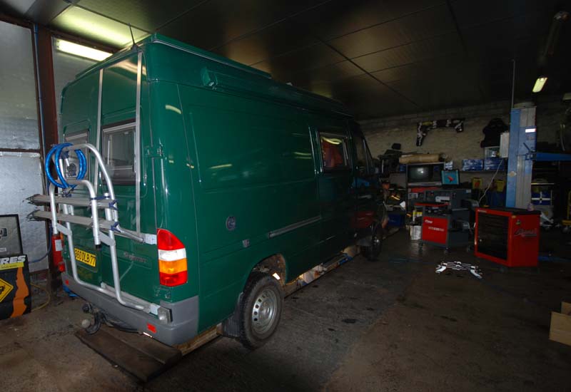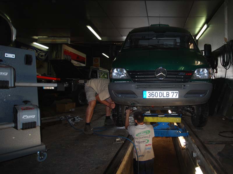 Quelques photos d'un Sprinter croisé dans un garage 4x4. Celui ci avait des pb de roulements sur le train avant...et venait pour un parallélisme, les pneus avant commençant à être vraiment malade.