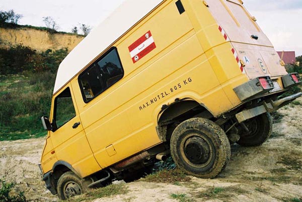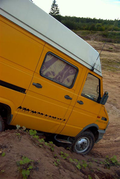 Justement, le pont en restant près du sol fait descendre le centre de gravité (il y a minimum 100kg qui se balade sur nos engins!) et encore une fois dans certain passage on joue serré, sur la photo l'iveco s'approche dangereusement de ses limites...
