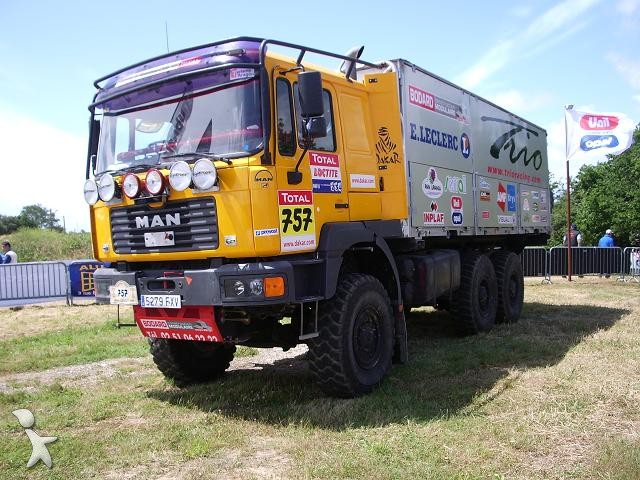 camion de rallye T4 MAN 6X6 24.463 T4 ou T5 Height : 3,3 m Weight : 12000 kgs INCLUDING : • Double point d'ancrage de cabine • Arceau de sécutité intérieur -pare branches • 3 Sièges bacquets • Gonflage -dégonflage automatique(not installed now, but included) • 6 cilinder engine : 11900 cc • 464 HP • Pneus XZL 14R20 Michelin • Gaz front axe shock absorver (can be regulated) • Gearbox : series