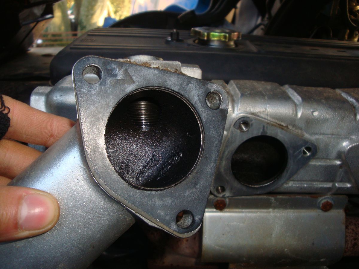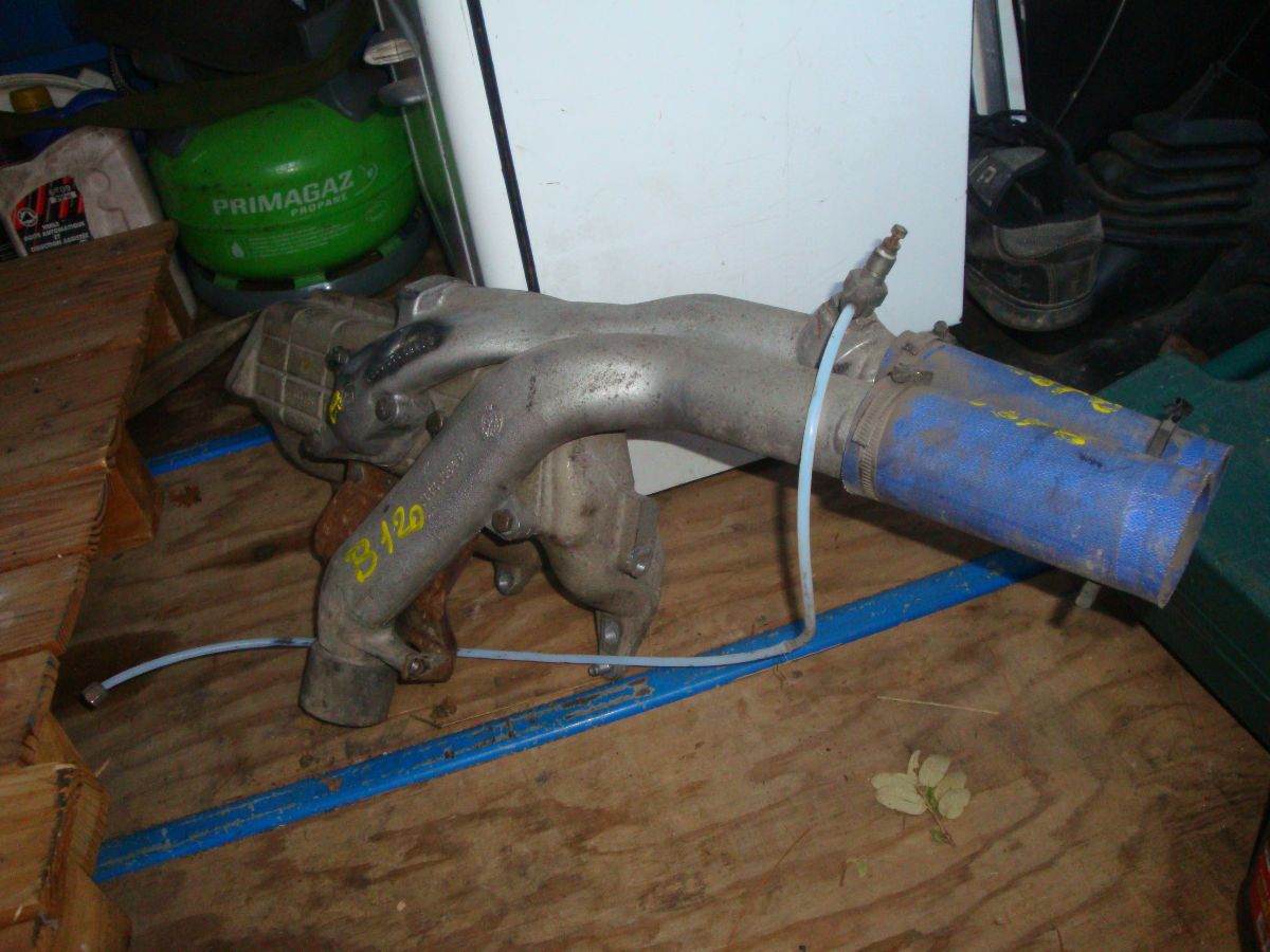 Je pensais pouvoir changer simplement la pipe d'admission et garder mon collecteur, mais il y a sur le collecteur du B120 deux goujons en plus pour fixer la tubulure trubo>intercooler : Allez c'est parti on démonte la pipe d'admission, 3 boulons sur la tête + 1 au niveau de la plaque de protection thermique, le joint a tendance à rester collé et à se déchirer par endroits, il faudra le changer : Le conduit était un peu gras, pas de traces d'huile liquide mais un peu gras dans toute la pipe, jusqu'au collecteur lui même.