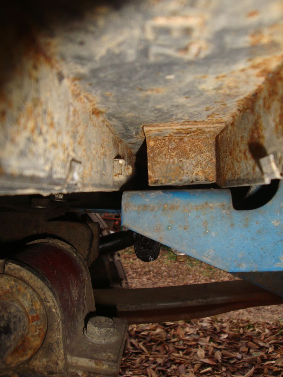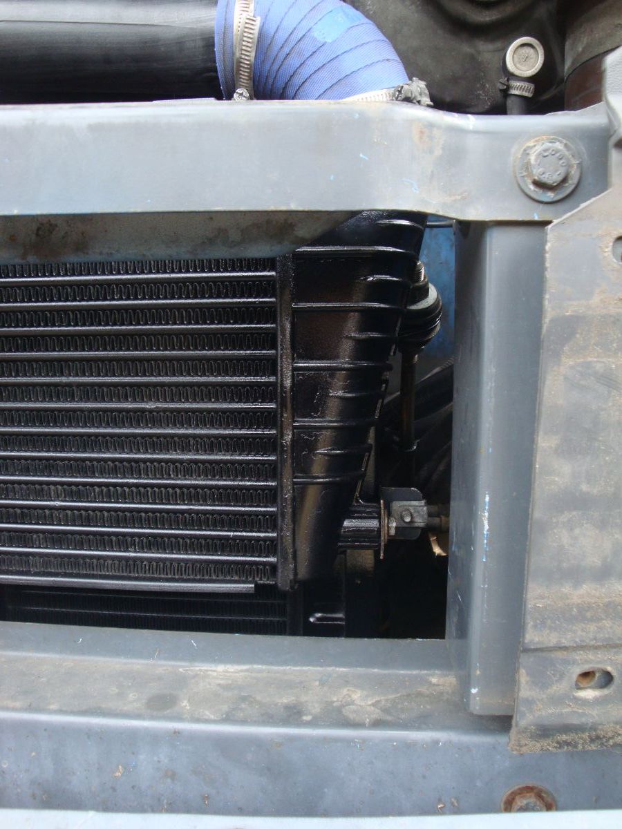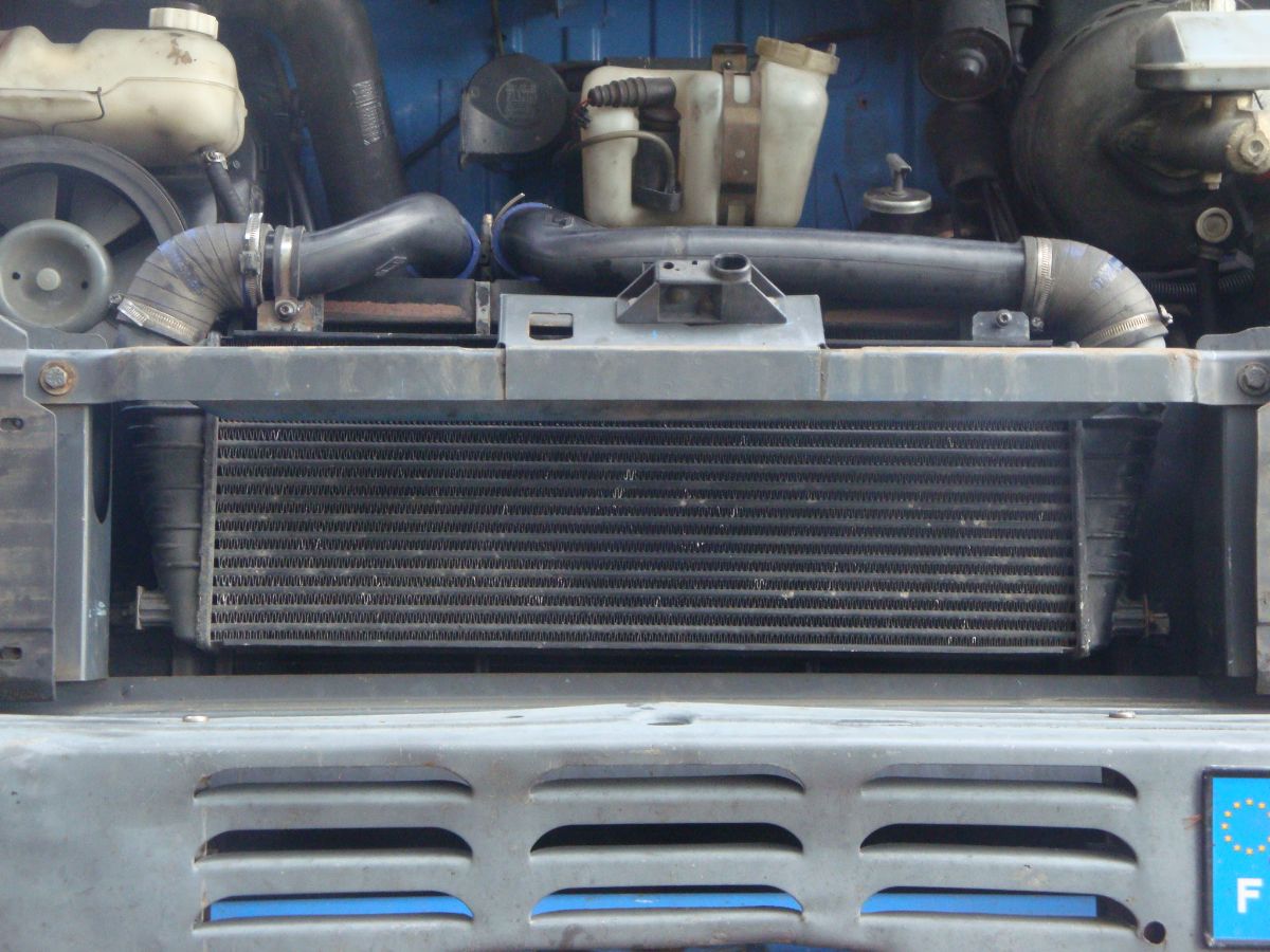 Les fixations de l'intercooler : Enlever le déflecteur d'air qui est devant le radiateur : Les fixations hautes viennent juste reposer ici : Ce sont les pattes du bas qui maintiennent réellement l'intercooler, sur un B90/110 elles tombent sur les déflecteurs d'air latéraux : En fait il faut virer ces déflecteurs aussi, car si on fixe l'intercooler dessus il devient solidaire de la caisse du fourgon alors que la radiateur, lui, est fixé sur le châssis et bouge en suivant ses mouvements de torsion. En croisement de ponts ça donne ça : Donc on vire ces déflecteurs : Visiblement le radiateur du B120 n'est pas exactement le même car il n'y a rien sur le radiateur du B90/110 pour venir fixer l'intercooler : Il faut donc rajouter des petites équerres au radiateur. Ca doit pouvoir se souder directement avec le radiateur en place sur le camion mais à mon avis c'est quand même galère, le plus simple est de le déposer.
