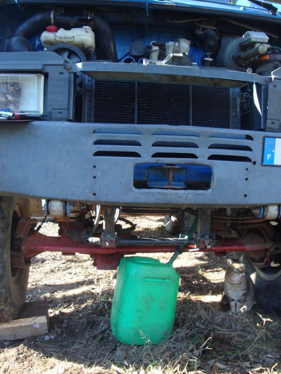 Donc vidange du circuit par le bouchon en bas à droite (s'il est grippé mettez du WD40 parce qu'il est fixé sur une tôle très fine du radiateur, c'est très fragile on peut l'enfoncer en appuyant dessus avec le doigt. Idem au remontage, ne pas serrer excessivement) : Au passage, j'ai vu que mon radiateur n'était pas droit : En y regardant de plus près je me suis rendu compte qu'il manquait un silent-bloc d'un côté