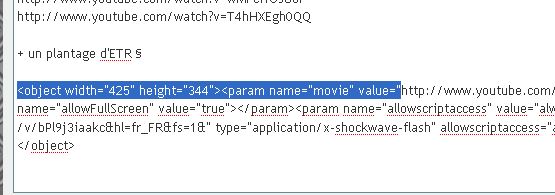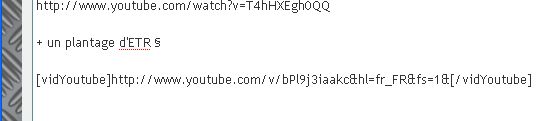 Si vous mettez une ou deux vidéos dans votre message, cela passera encore mais si vous en collez 14 ou 15 comme Bastien, ben ça plante ma machine (256 Mo de mémoire, pas possible d'en ajouter). De plus ça alllllonge le temps de chargement de la page tout en consommant de la bande passante et du courant pour des vidéos qui ne nous appartiennent pas.