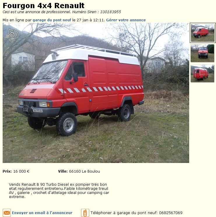 Vends Renault B 90 Turbo Diesel ex pompier trés bon etat regulierement entretenu.Faible kilométrage treuil AV , galerie , crochet d'attelage ideal pour camping car extreme.